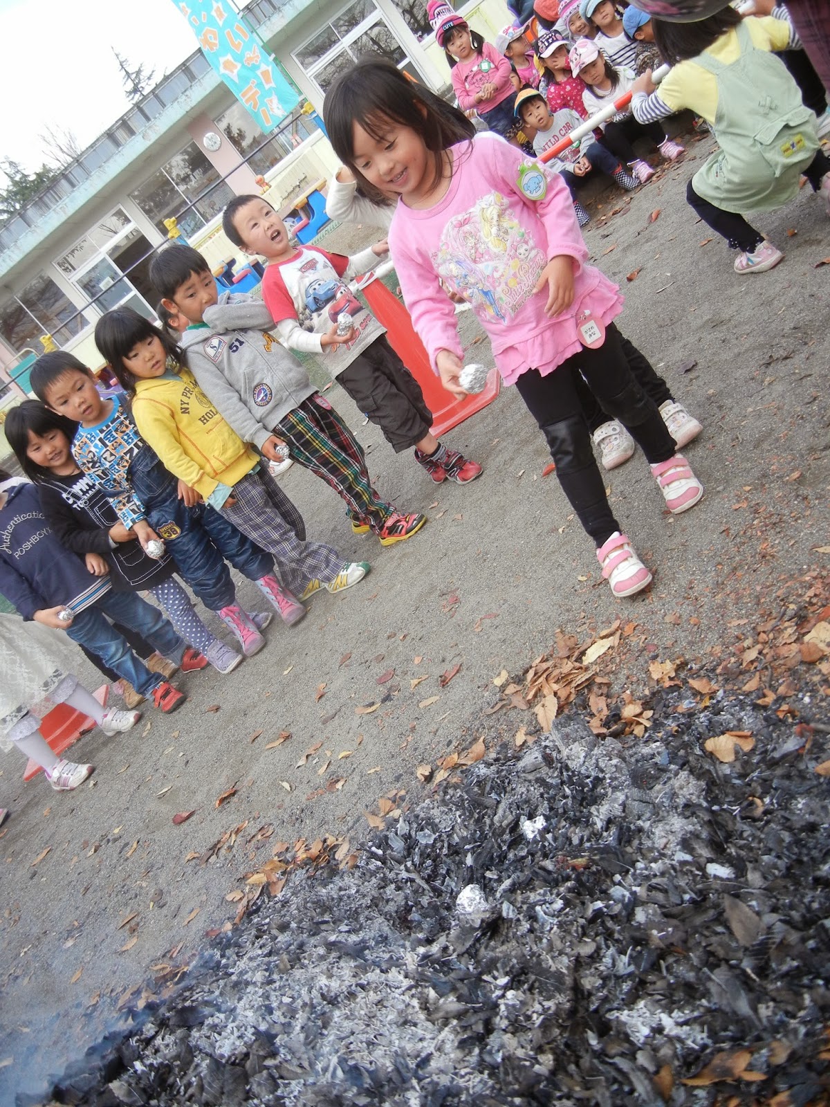 今日1日の締めくくりは、焼き芋パーティーです!自分でくるんだお芋を、自分で焚火の中へ放り込む!「あったかいね~」とか、「煙がくさい~」なんて言いながら、たき火を囲みます。お部屋の中で遊んでいても、焼き芋の事が気になって、窓からのぞいてみたり、「できた~!?」って叫んでみたり。ホクホク、ちょっぴり焦げ色がついたお芋、おかわりまであっという間に食べてしまいましたよ!食べ終わる速さにびっくり!!