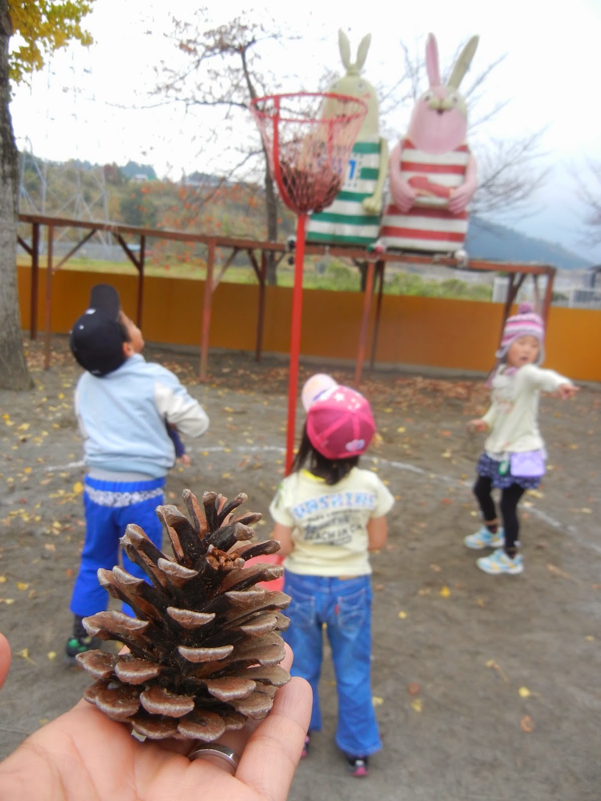 運動会でみんなが使った玉入れ。今日の玉入れは、松ぼっくりでやってみました。これがなかなか難しい!!全部入れるんだ!!って頑張っていましたよ!