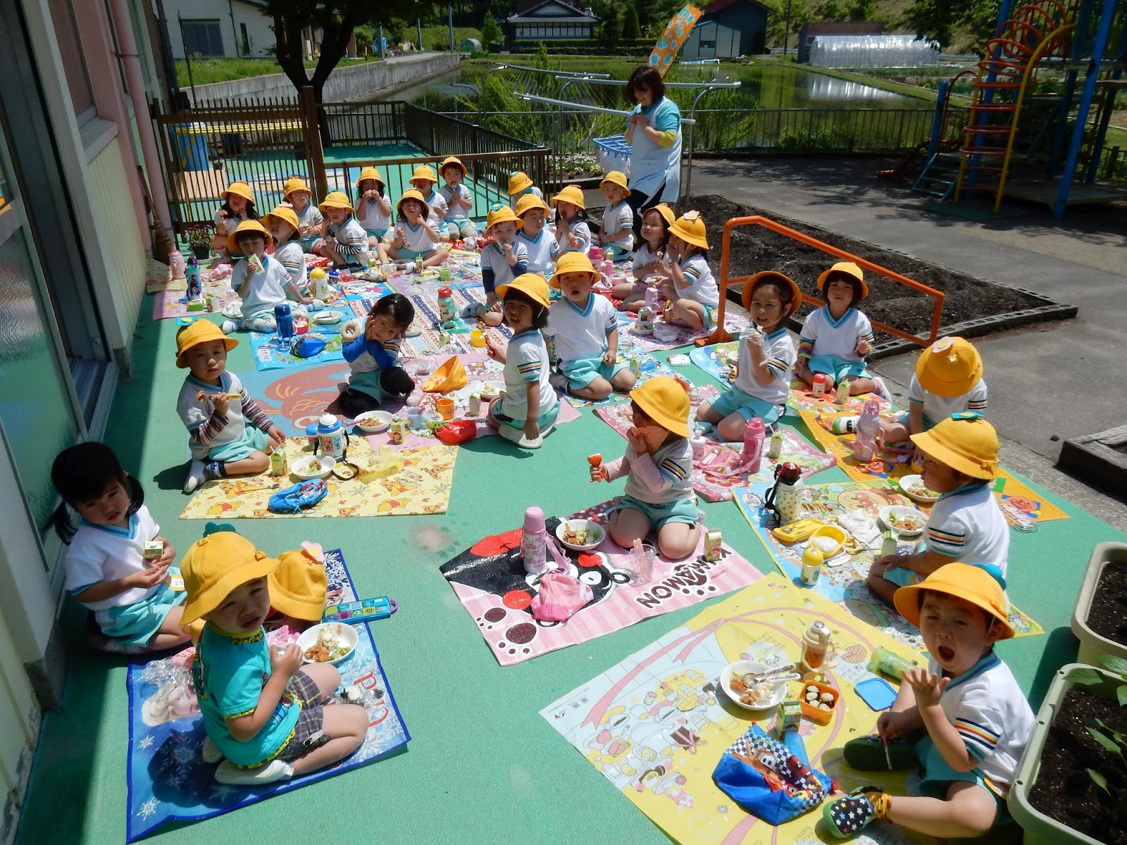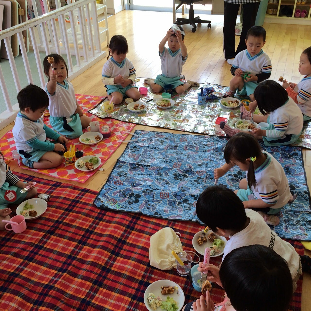 今日は敷物を用意してもらっていたので、活用させていただきました。すみれさんも、大きなレジャーシートの上で、美味しそうに食べていましたよ!おにぎりも、とっても嬉しそうでした。いつもと少し環境を変えるだけで、いつもより楽しく♪給食の時間が過ごせました!
