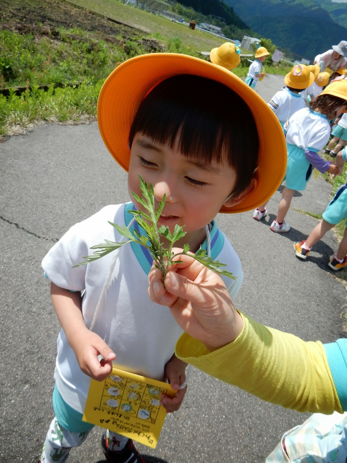 お散歩に出かけると、発見が一杯です。ヨモギの葉っぱを見つけたので、においをかいでみました。『くさ~い!』おもわず出た言葉(笑)園庭にいるだけでは感じられない春の自然をたくさん見つけることができましたよ。