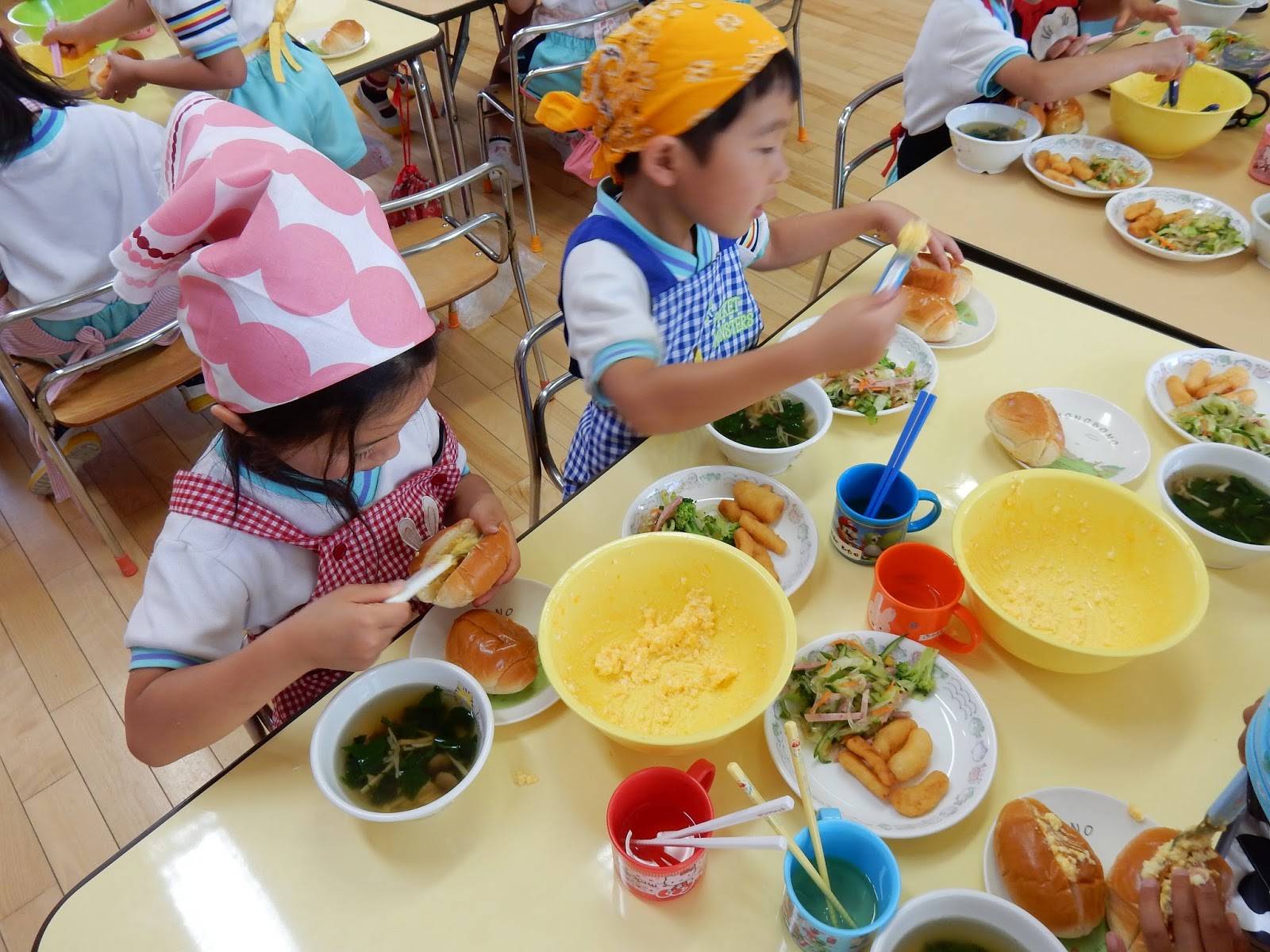今日の材料はゆでたまご。殻をみんなで割って、スプーンやフォークでつぶしていきます。細かく、細かくつぶして、マヨネーズと混ぜれば、卵サラダの出来上がり♪バターロールにはさんでいただきま~す♪とってもおいしそうです。簡単に、しかも安全にできるクッキング、おうちでも試してみて下さいね。