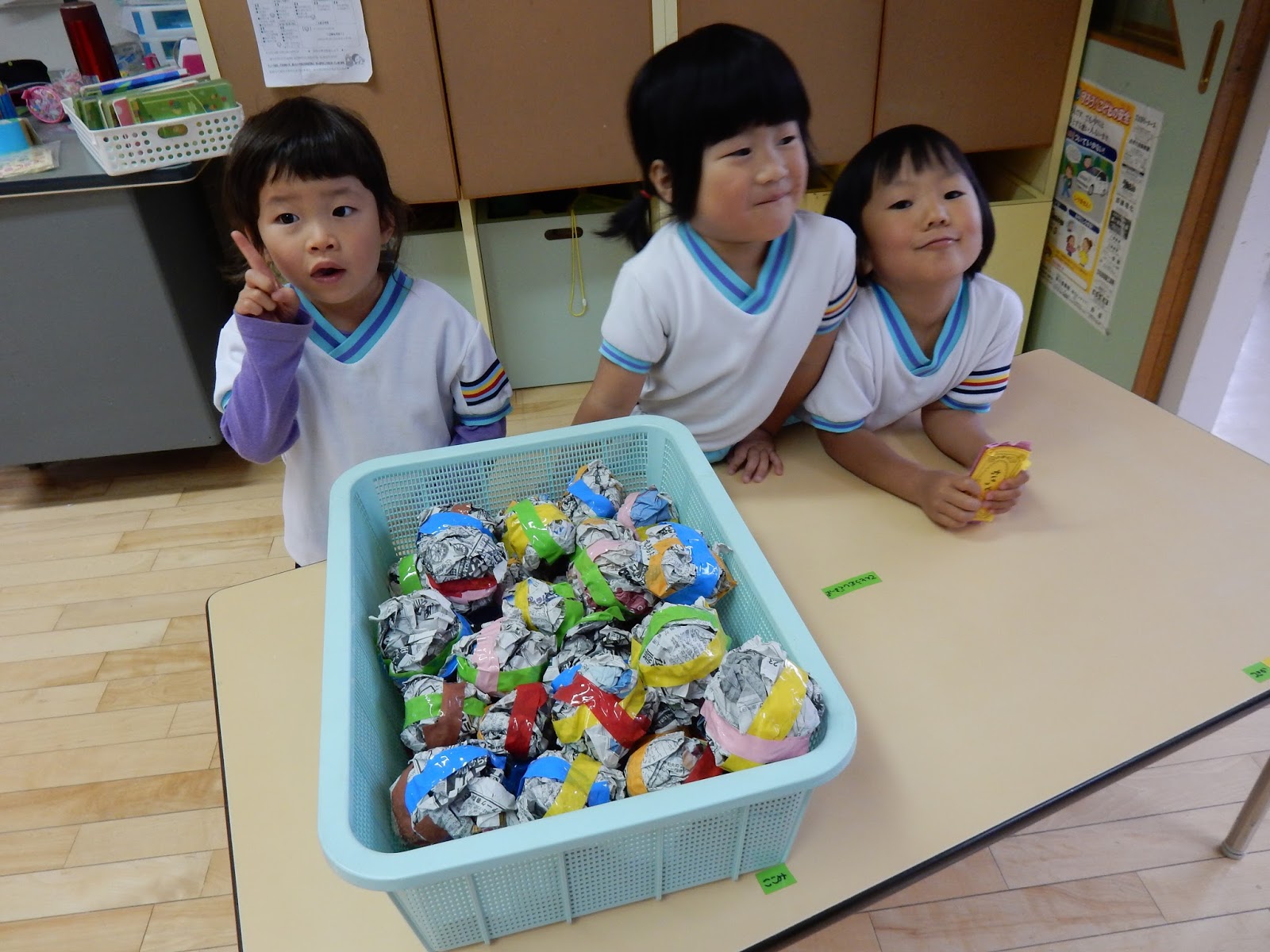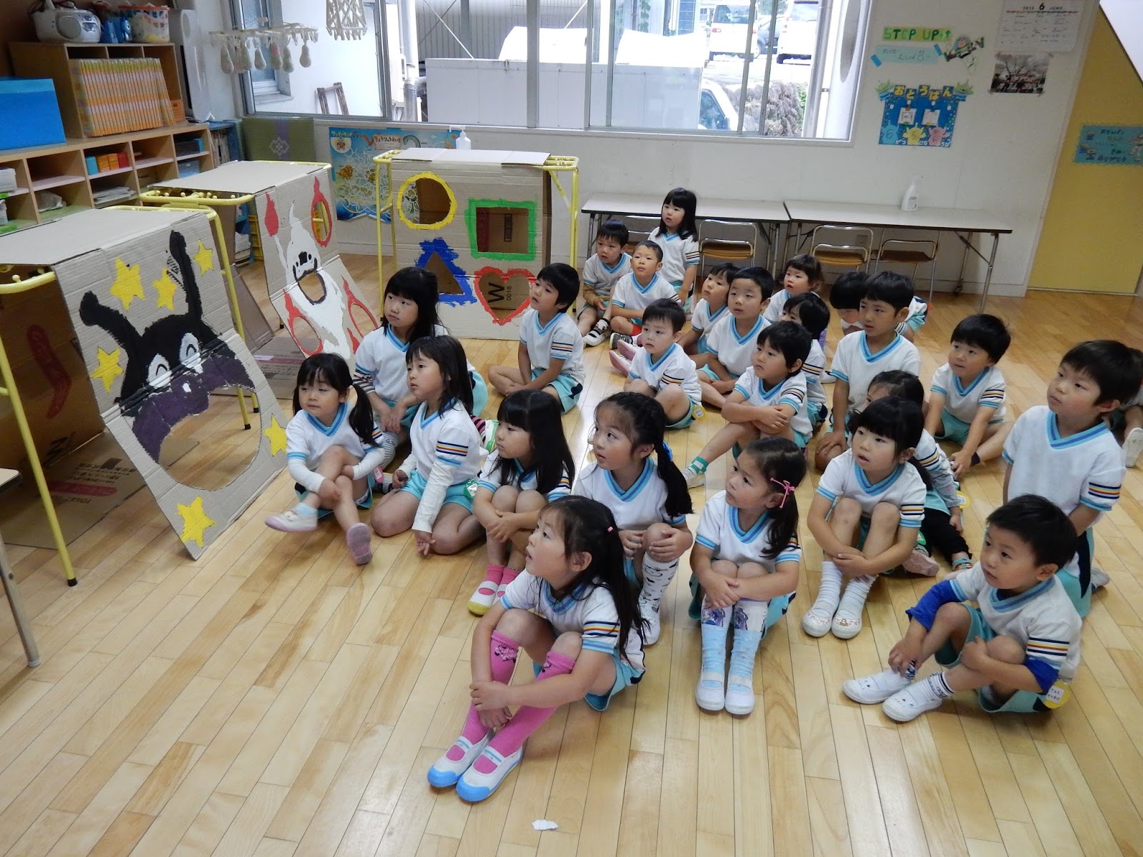 6月のわいわいデーは、おまつりごっこです。3つの屋台を用意して、お店屋さんと、お客さんにわかれてまわります。今日は、グループごとに、スムーズにお店ができるように練習をしました。とっても楽しそうに遊んでいたので、様子をお見せしたいのですが、わいわいデーまでとっておきますね!どんなお店があるかは、写真から想像してください♪当日は、すみれさん、ひよこさんもお店に遊びに来てくれますし、クラスで作ったおみこしもかつぎます。楽しみが一杯のわいわいデーは、来週の火曜日、9日です!