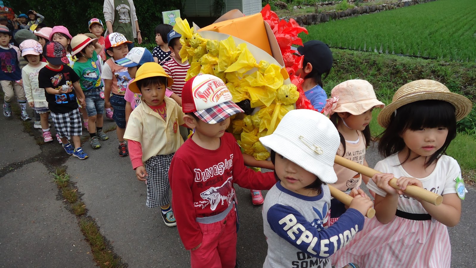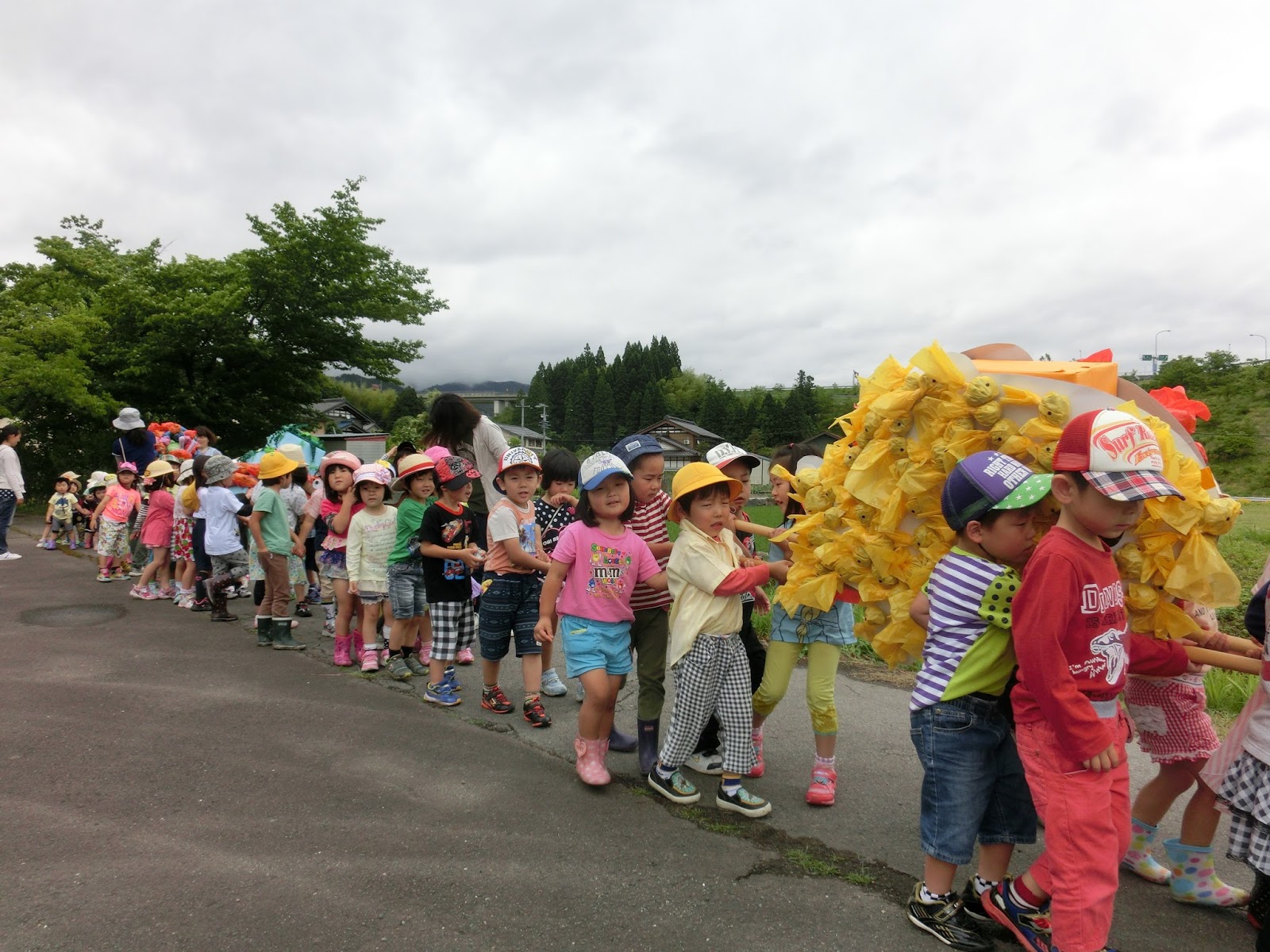 たんぽぽさん以上の大きいお友達は、保育園を飛び出して、農道を歩いてきましたよ!順番におみこしをかつぎ、後ろか来るお友達も元気にかけ声をかけます。雨もやんで、みんなニコニコ笑顔だったみたいですね!はらぺこあおむしや、スイミー、999匹のきょうだい。絵本から飛び出したキャラクターを作ってくれましたよ!