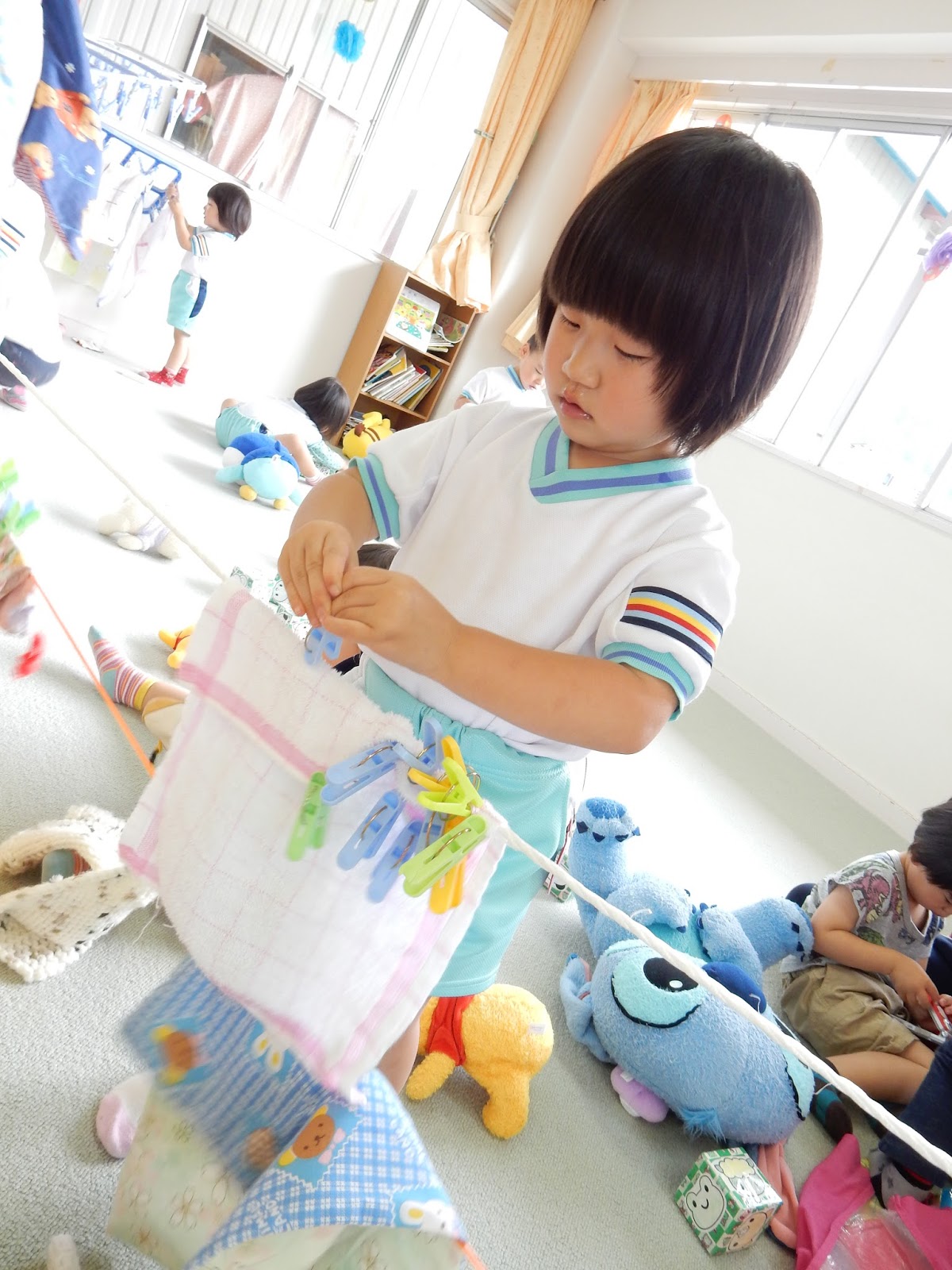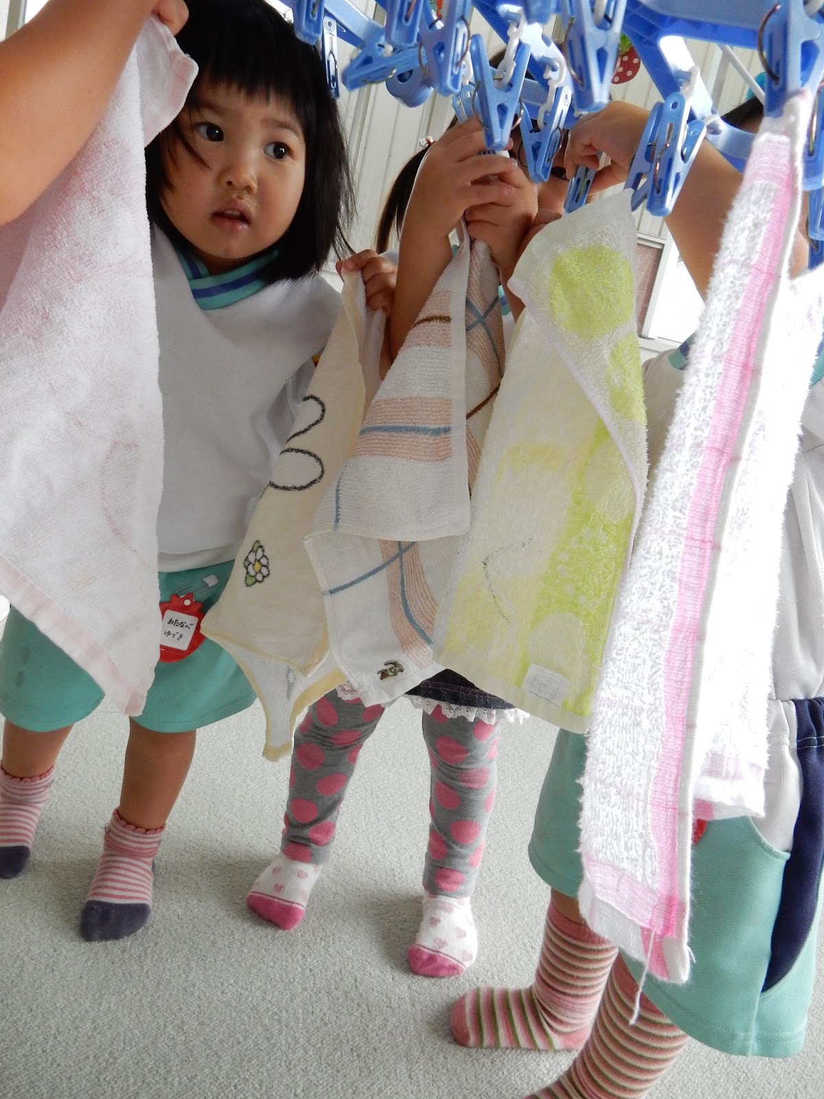 今日は午前中、雨が降っていたので、どのクラスも室内で過ごしていました。『洗濯物』がいっぱい並んだよ~』というお知らせを受けてすみれ組へ...