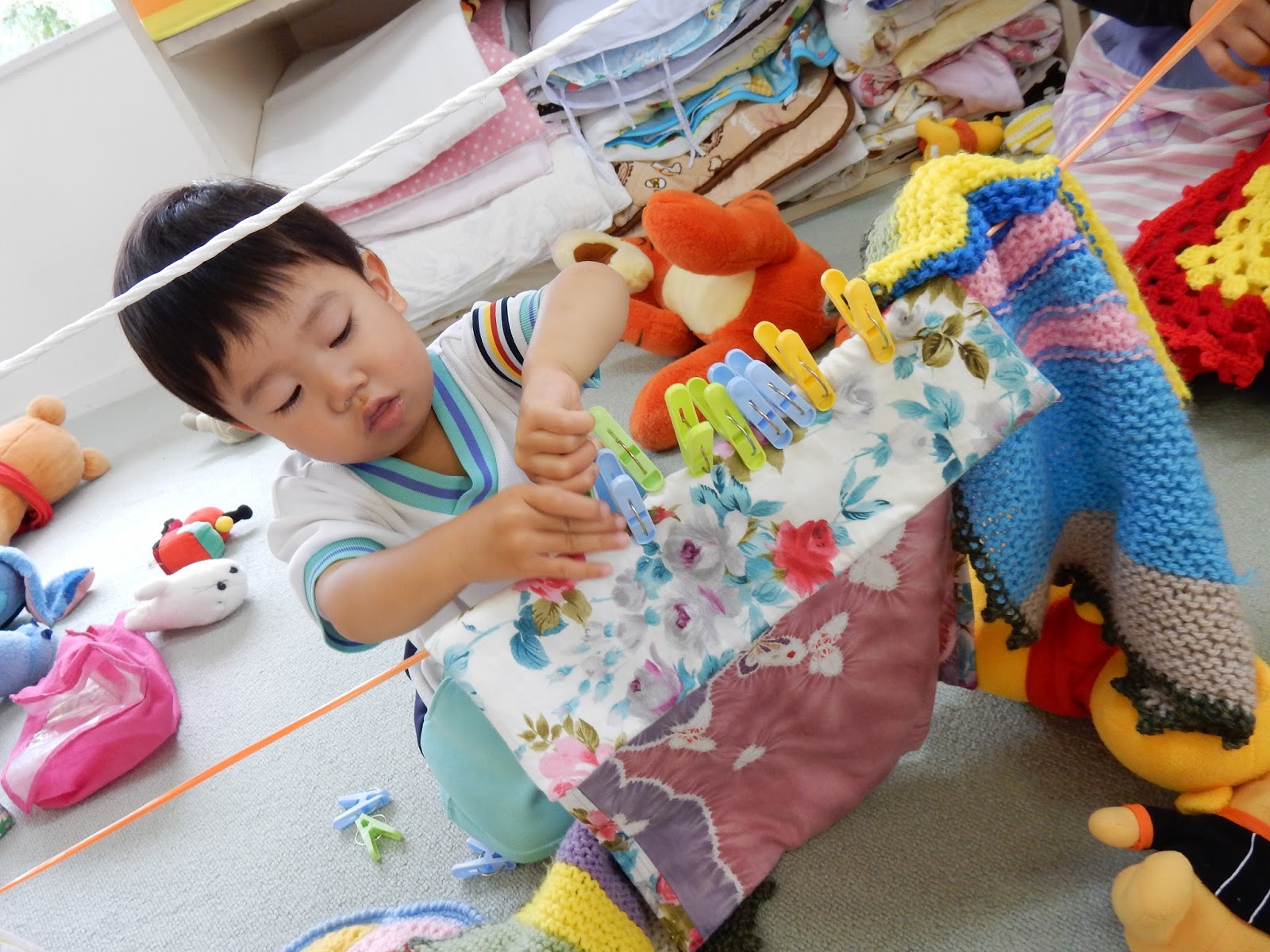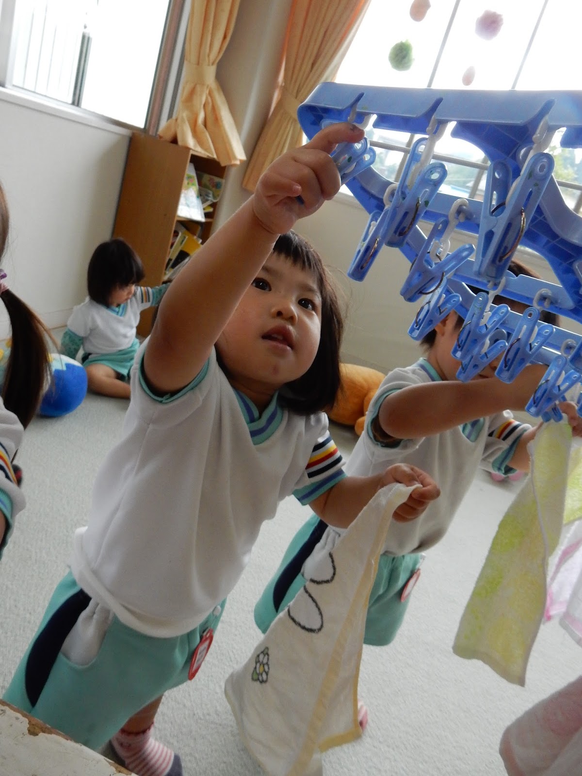 真剣です!お部屋の手すりを利用して作られた物干しスペースには、ズラリと洗濯物が並んでいました。カラフルな洗濯バサミがかわいらしいです!みんな器用に洗濯ばさみをギュっと握っています。