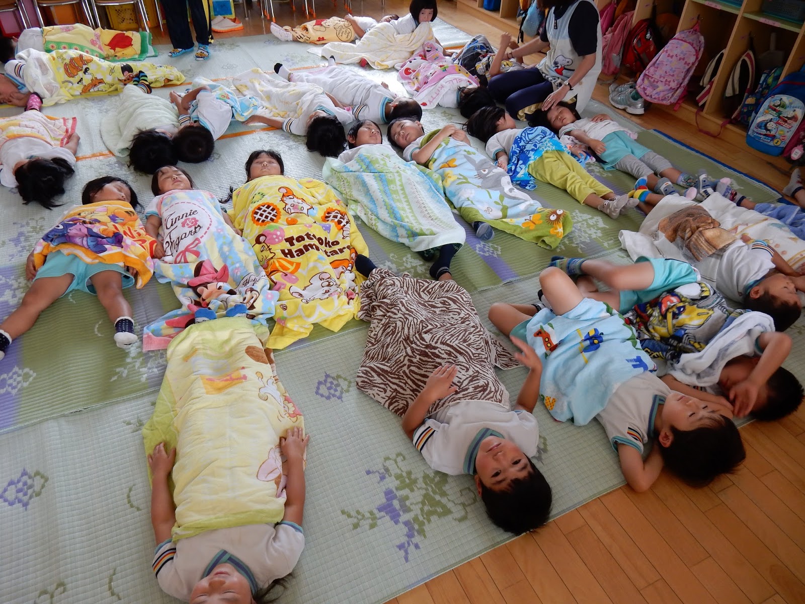 たくさん遊んで、給食の後は、たんぽぽさん以上のお友達もお昼寝タイムです。これから夏の間はこんな感じで体を休める時間もつくっていきます。
