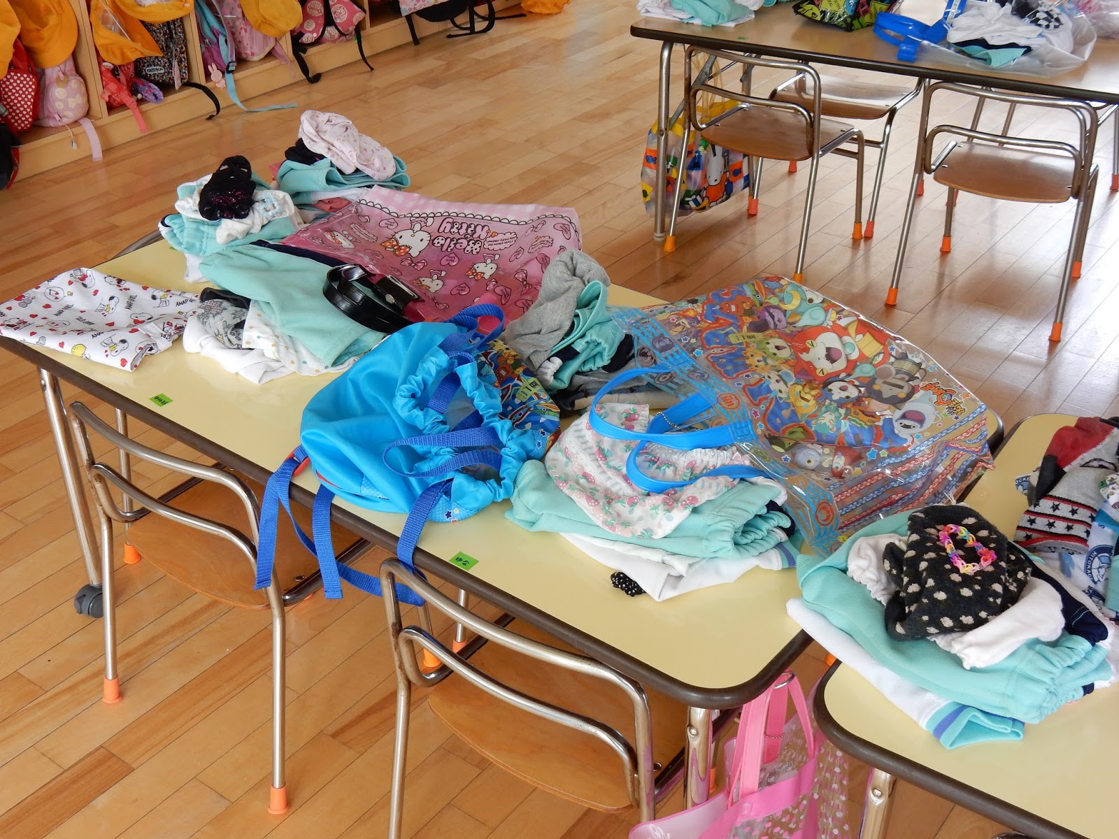 プール遊びのために、みんなお着替えは自分で頑張ってるんですよ!脱いだ服もきちんとたたんだり、プール鞄にかたづけます。大きい子だけではなく、小さいお友達だって自分で頑張ります!お家でも、用意の時間に少し余裕を持っていただき、子どもたちが自分で着替えができるよう応援してあげて下さい。サンダルも、きれいにそろっていると気持ちいいですよね!