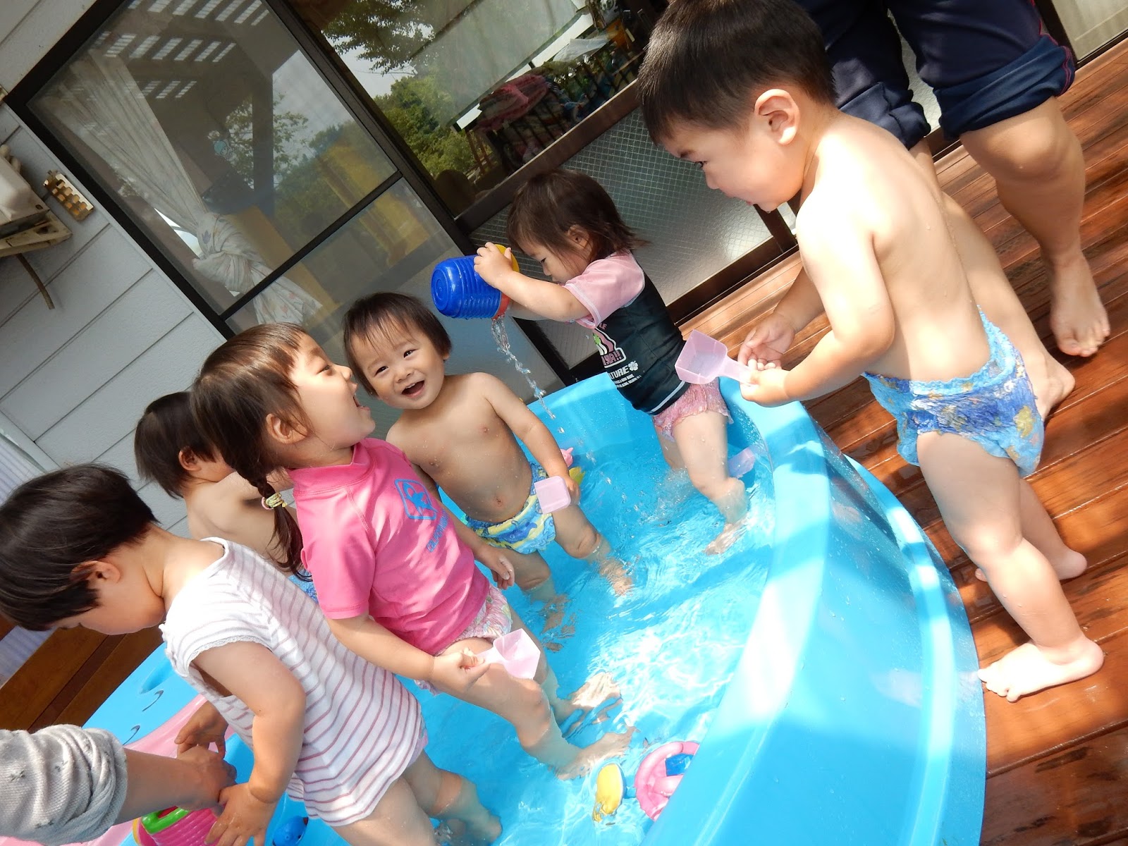 ひよこさんは、お部屋からテラスに出て水遊びです。最初はちょっと怖がっている子もいましたが、だんだん自分からばしゃばしゃ!できるようになっていきました!お水をすくって、体にかけて...つめたいね!気持ちいいね!先生と会話を楽しみながらニコニコでした。