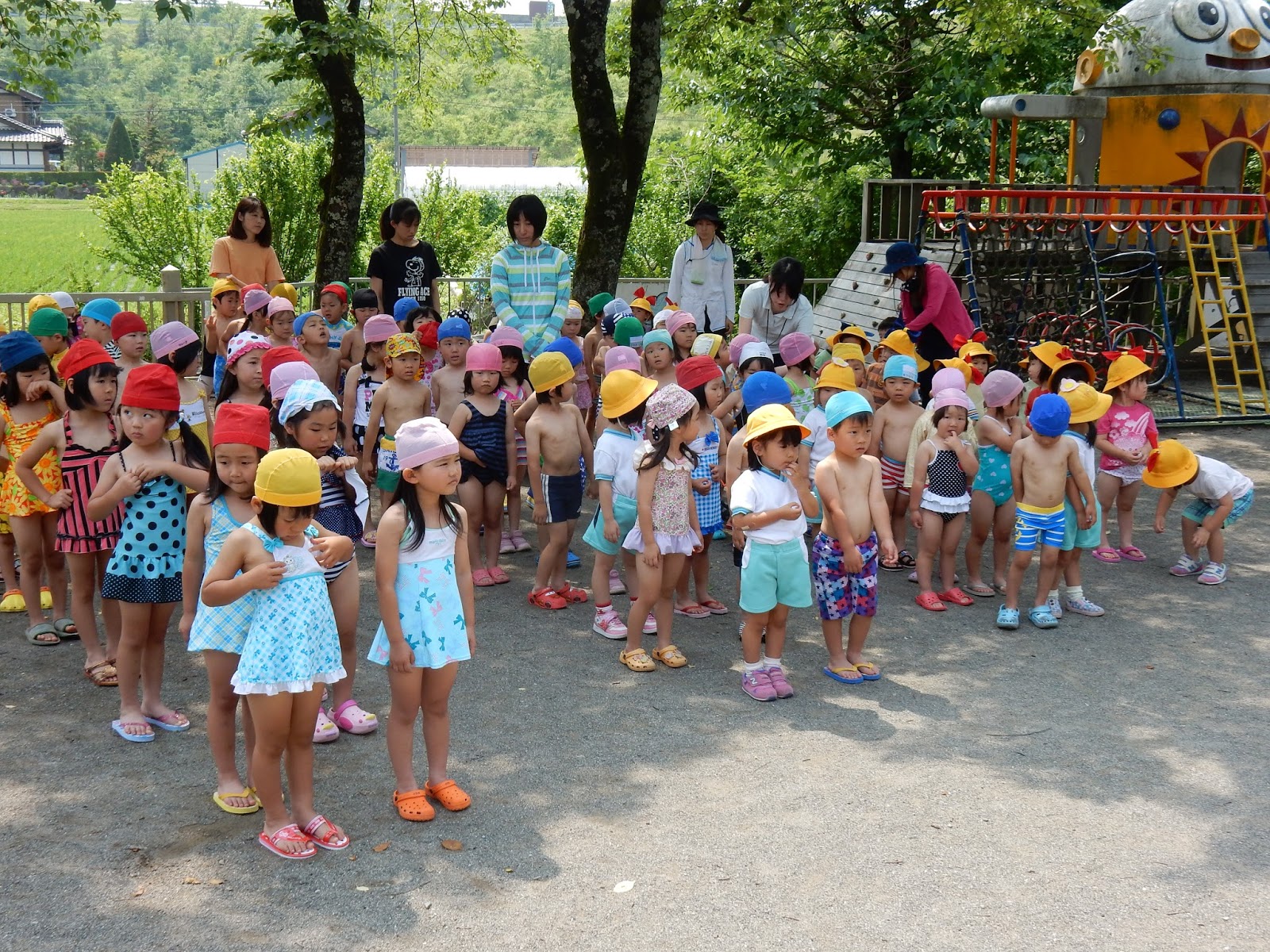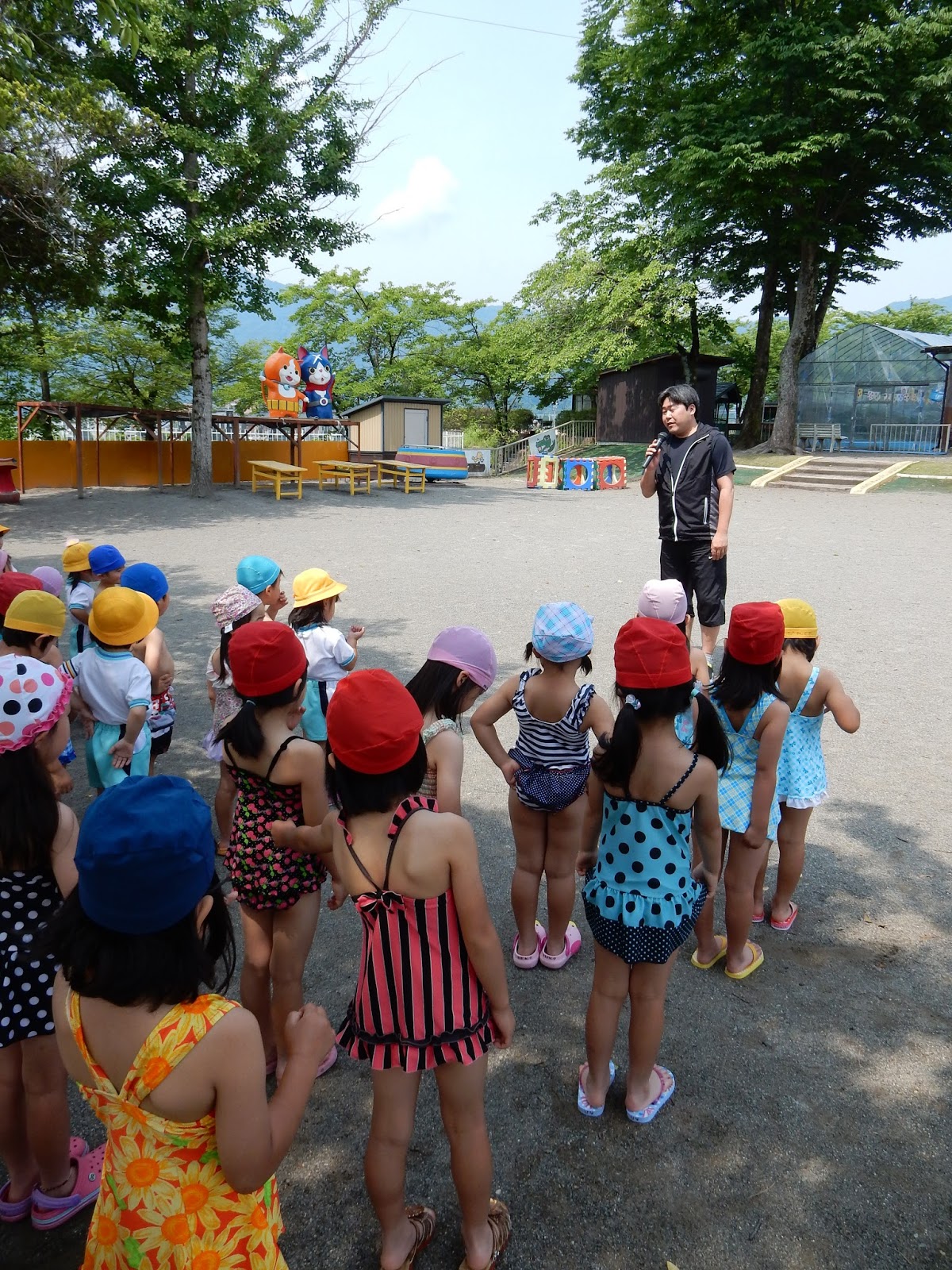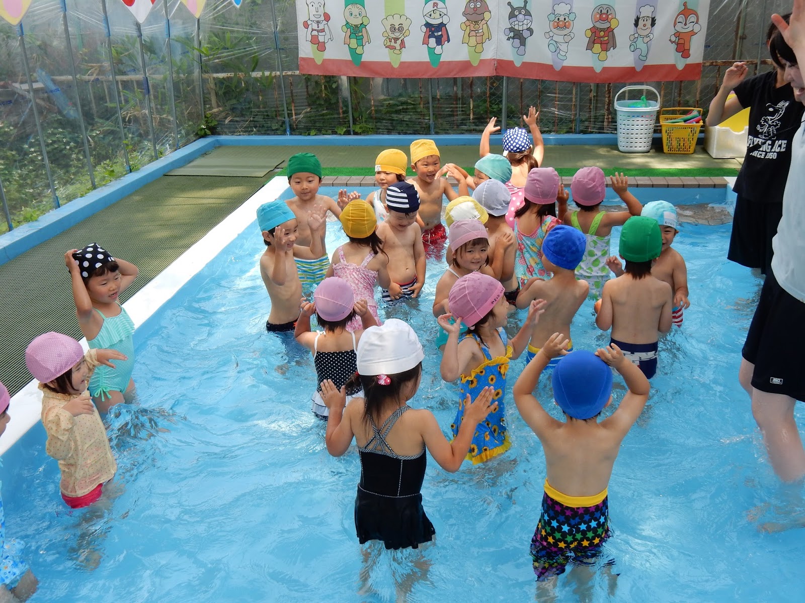 今日は、今年度初めてのプール遊びという事で、園長先生のお話を聞き、しっかりとお約束を聞きます。風邪や病気には気をつけましょう!プールに入る前にはトイレに行きましょう!などなど...お約束たくさんです!でも大好きなプール遊びです、みんな真剣にお話を聞いてくれました。みんなで準備体操をして、いよいよプールに入ります!