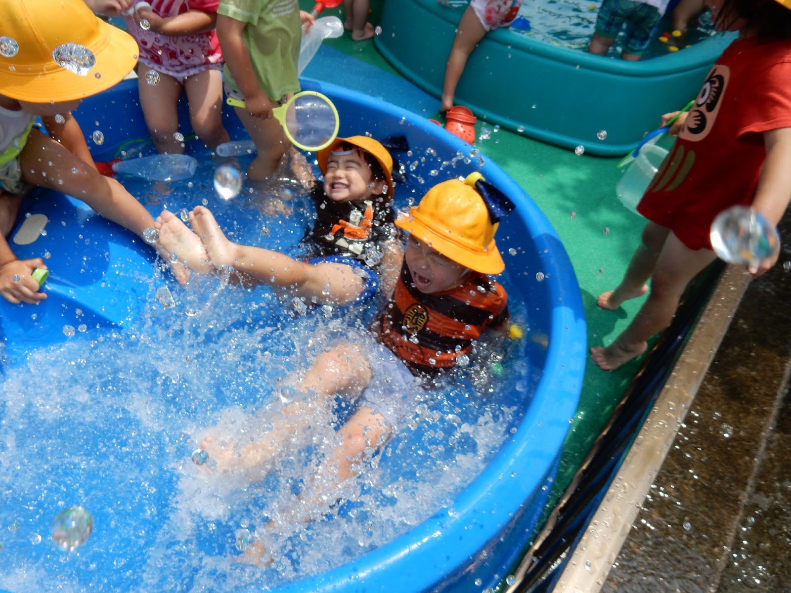 ひまわりさんになると遊びもダイナミックになります!みんなでプールの中をぐるぐる走ります。ぐるぐるぐるぐる…どんどん水流ができていきます!そしてみんなでばしゃん!!流れるプールの完成です!結構勢いよく回るんですよ~。そして水鉄砲を持ち出せば、先生に向かって集中攻撃!もちろん、倍返しされるんですけどね(笑)