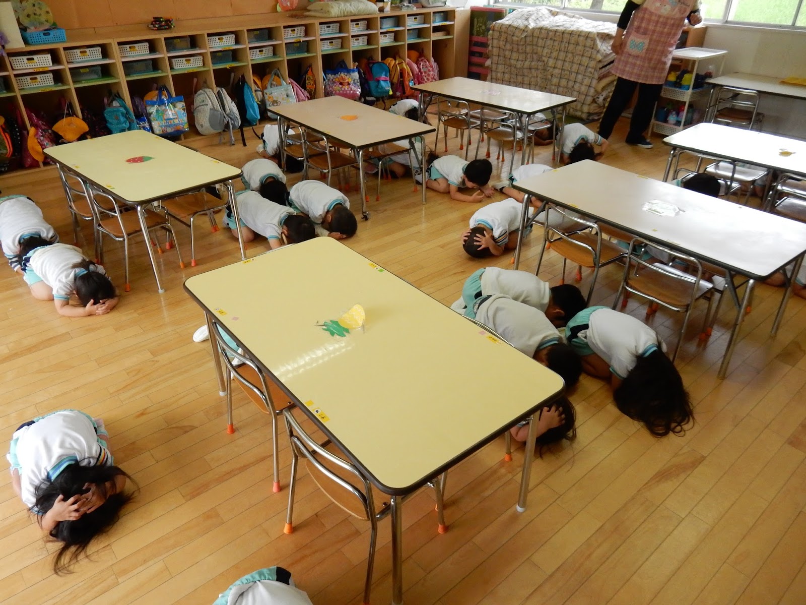 今日は、今年初めての地震訓練だったので、各クラスで先生からしっかり話を聞いて、避難方法を確認してから、実際に訓練をしました。『わかった!』『だいじょうぶ!』と準備万端の子どもたちでしたが...