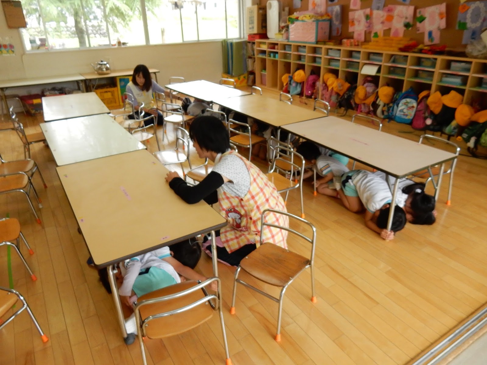 実際に地震の合図の大太鼓が鳴ると、すぐに外へ飛び出そうと走り出したり、机の下でお友達とぶつかってしまったり、ビックリして泣き出してしまったり。でも、先生のお話を聞いている間に少しづつ落ち着いて、机にもぐってからは、みんなじっと地震がおさまるのを待つことができました。