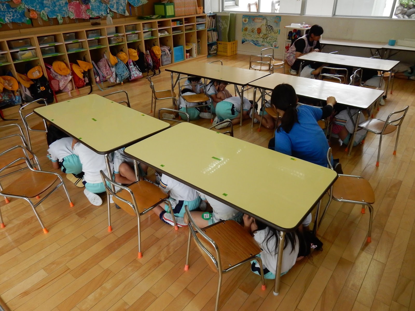 こんな感じで仲良く机の下にもぐって、上から落ちてくるものから体を守ります。