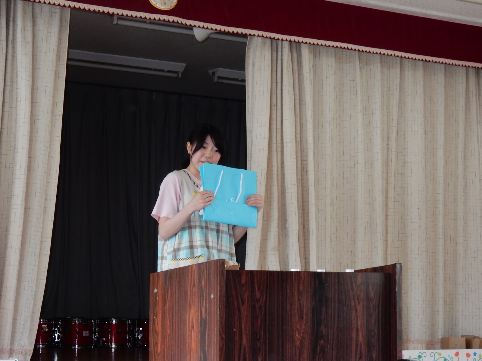 今月は、あい先生がお話を2つ見せてくれました。紙袋を取り出したあい先生。何が入っているのかな??