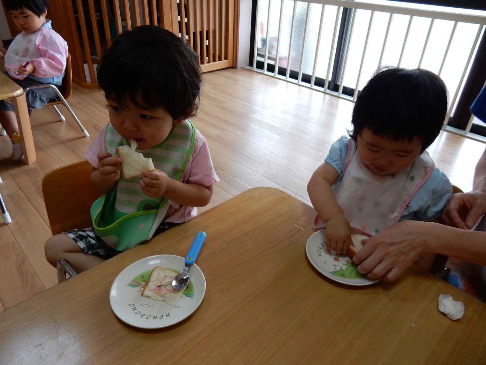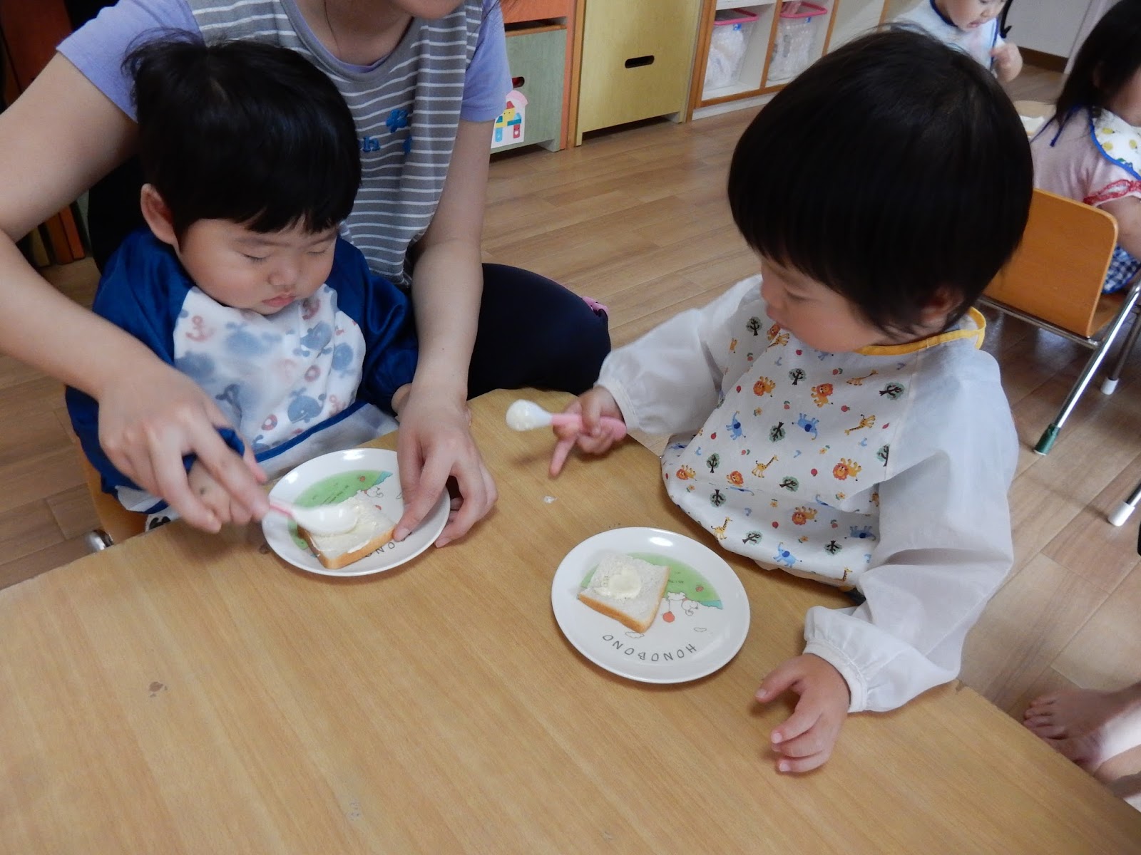 パンをもらったら、マヨネーズをスプーンで塗っていきます。1歳児さんは自分で上手に塗っている子が多かったですよ!