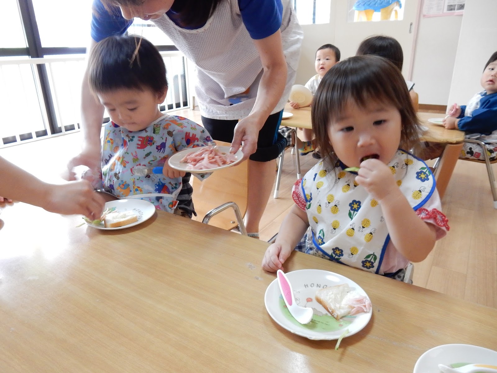 パンの上にきざんだハムときゅうりをのせていきます。食べやすいように先生が切ってくれましたよ!目の前にはおいしそうなハムやきゅうり。パンにはマヨネーズ…誘惑が一杯です!