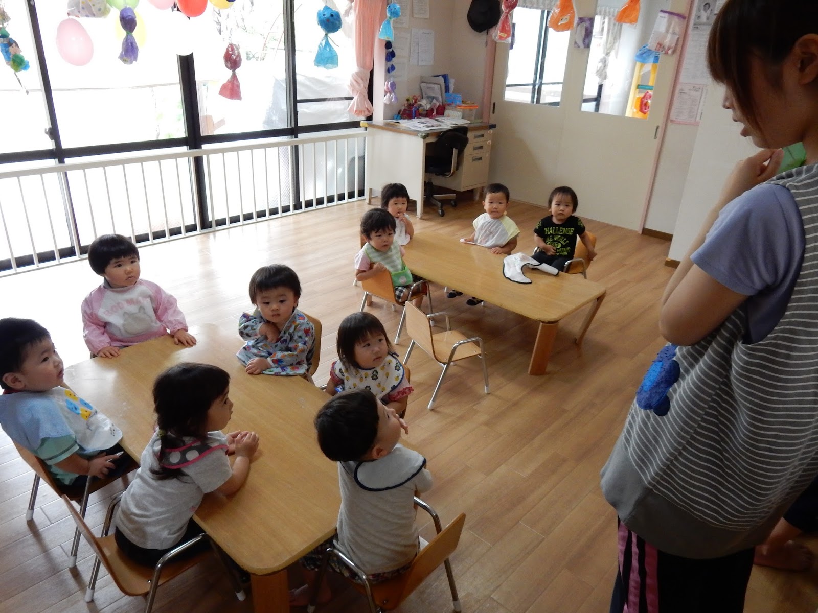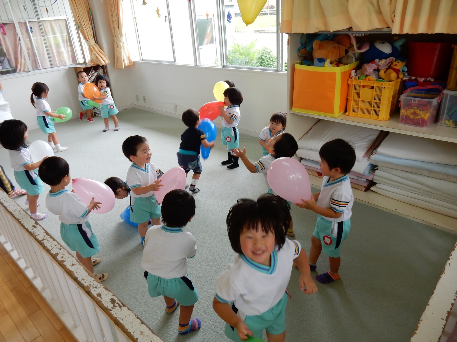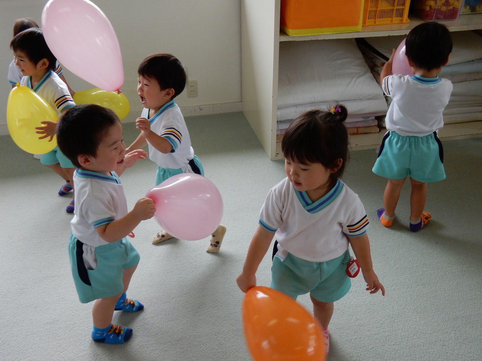 そんな時は、元気いっぱい体操の音楽をかけて踊ったり、お部屋の中で風船あそび!バン!!!ってはじけてビックリしながらも、みんな夢中で遊んでいました!