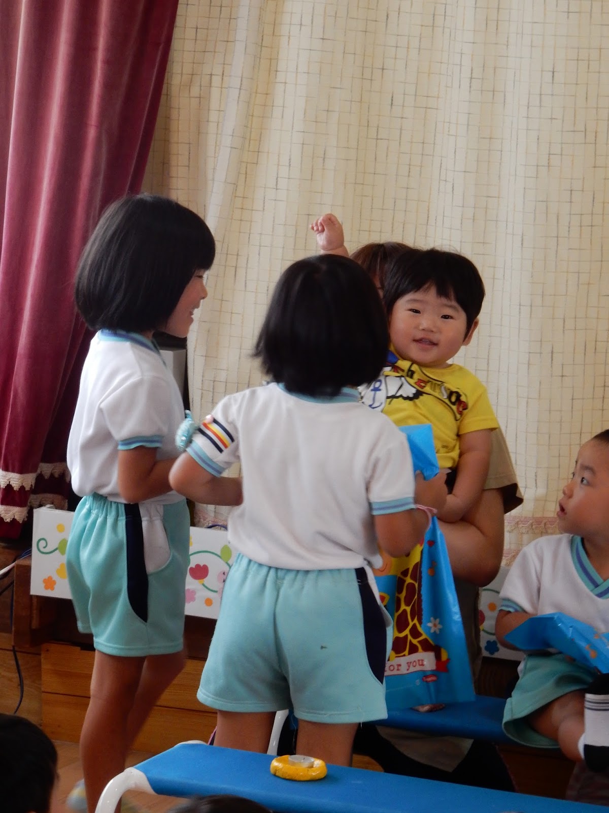名前や年を聞かれて恥ずかしそうに答えたり、1歳になったお友達は、お姉ちゃんに名前を呼んでもらって嬉しそう♪