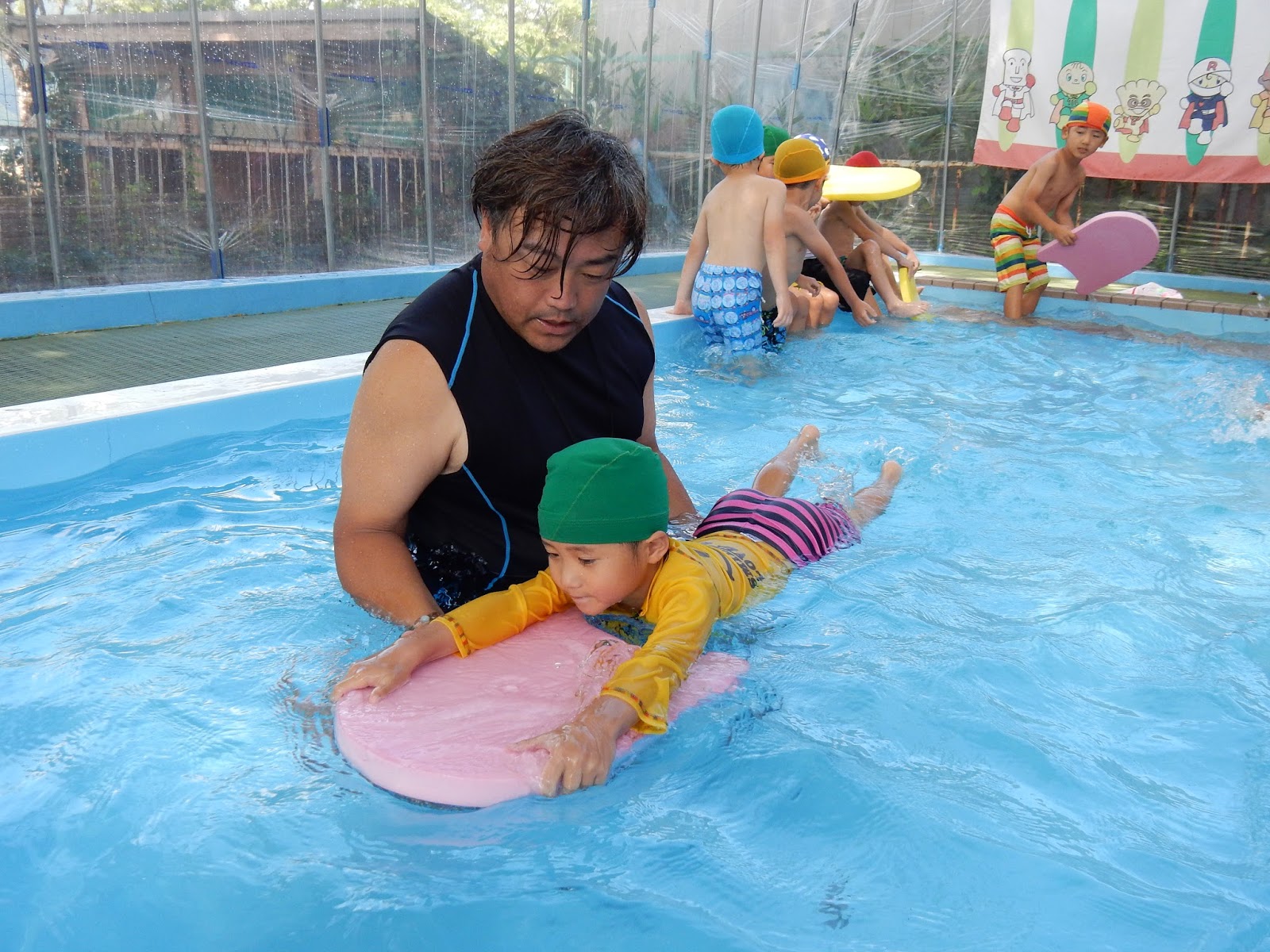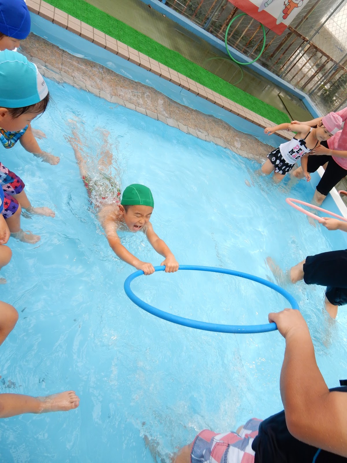 プール開きから1か月。途中、雨が続いて入れない日もありましたが、ずいぶん水に慣れて、あそびがダイナミックになってきました!ワニ歩きや、顔付け、蹴伸びなど次のステップを聞くことができました!できるようになったことをゴロゴロ先生に見ていただくことができて、みんなも得意げでした!