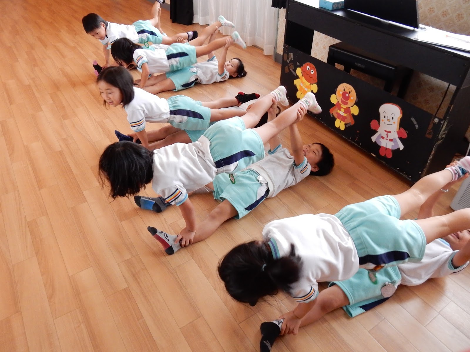たいそう教室を通して、子どもたちの筋力の低下を感じずにはいられません。腕、腹筋、背中など、体の筋肉が発達していないと、バランスをとることや、正しい姿勢を保持することも難しくなります。もちろん、組立たいそうなんかで、友達を支えたり、自分自身を支えたりすることが困難になります。年長さんだから!ではなく、組立体操のため!ではなく、普段から、お子様とスキンシップを取りながら、筋力アップ!を目指しましょう!例えば、ハイハイや、お尻歩き、雑巾がけや、手押し車なんかがいいそうですよ!