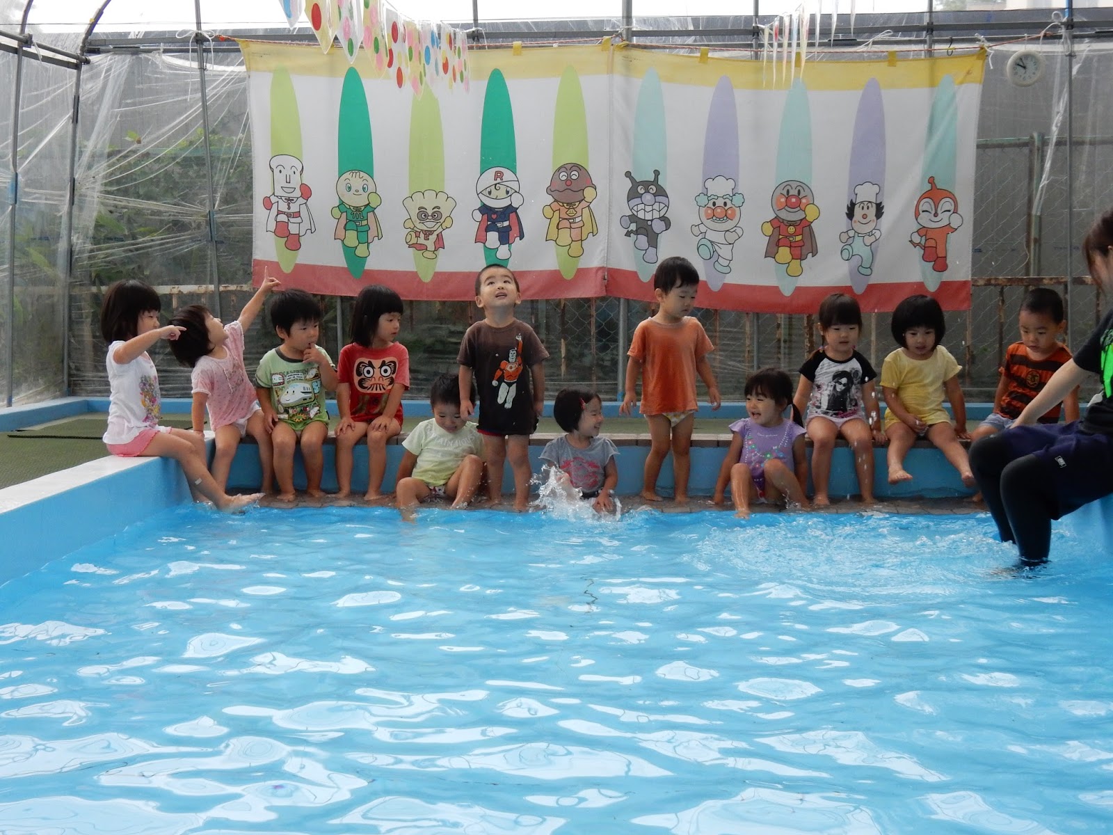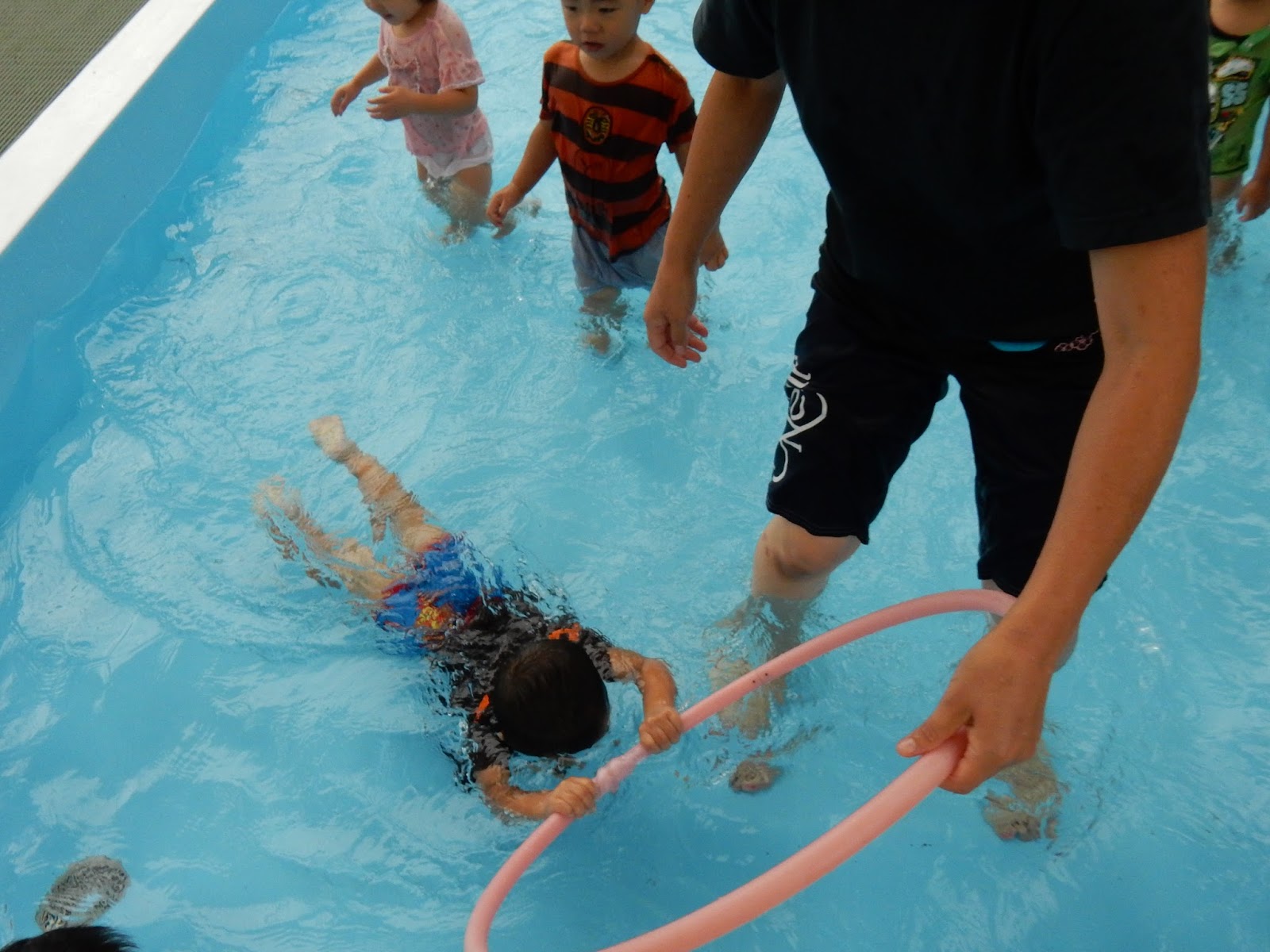 いつもテラスのプールに入っているすみれさんが、今日は大きいプールに遊びに来ました!とっても広くて大きなプール、たくさんの水に最初はビックリ…することもなく(笑)みんなとってもうれしそうだったんです!いつもテラスのプールでもダイナミックに遊んでいるみんなだったので、今日は、先生に手を引いてもらったり、自分でワニ歩きをしたり。なかには、すみれさん!!?とこちらが疑うほど見事な泳ぎを見せてくれるお友達もいたんです。今週いっぱいで終わってしまうプール、最後に思い出できましたね!