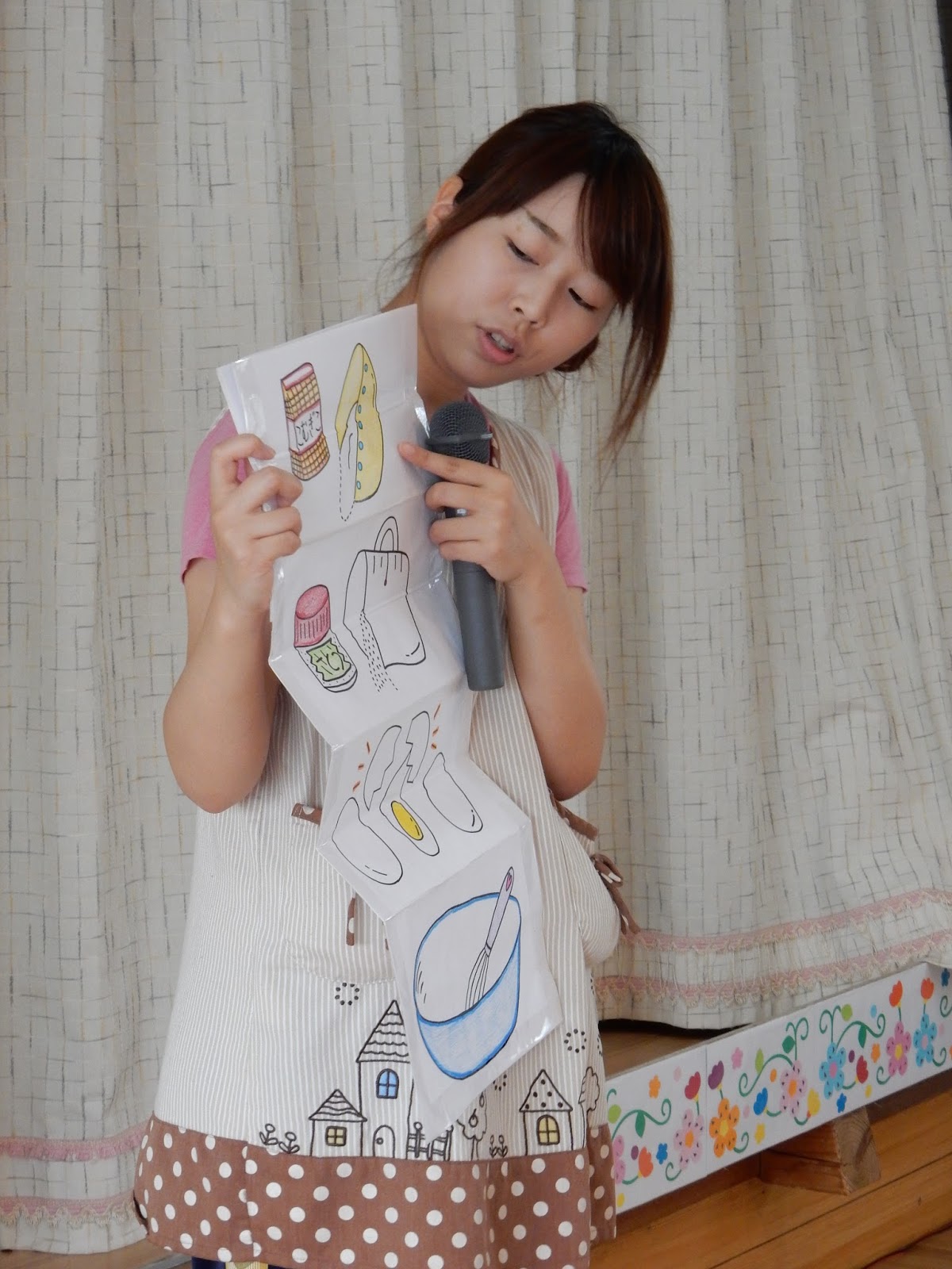 あやか先生からは、2つのお話をプレゼントしてもらいました。赤ずきんちゃんが出てくるお話と、もう1つは、ボウルの中に、いろんなものを混ぜ混ぜ…