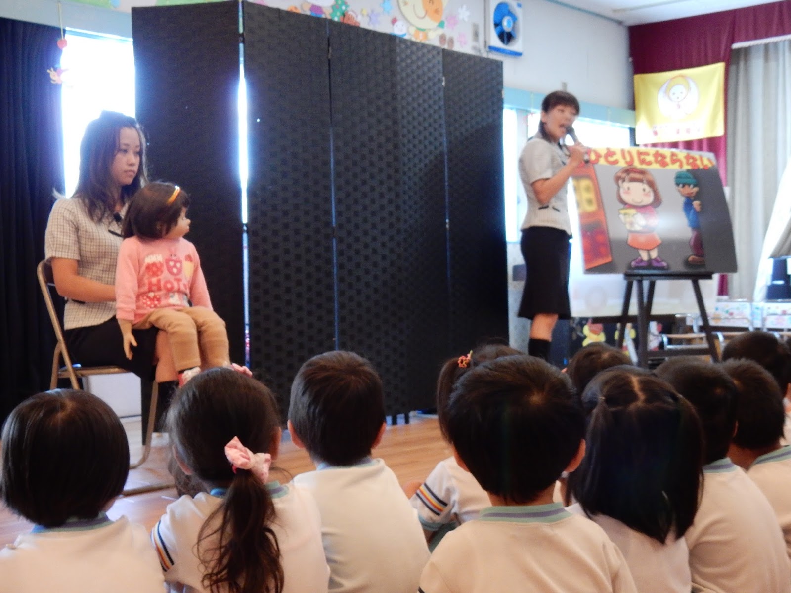 このお約束をみんなで聞きました。大声の練習では、人形ののんちゃんがびっくりして倒れてしまうほどに大きな声で『たすけて~!!!』と叫んだみんな。