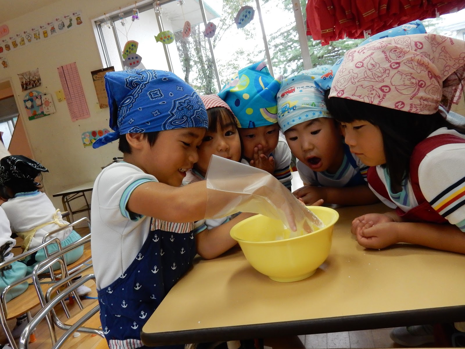最近涼しくなってきて、季節はすっかり秋です。季節の移り変わりを、風の冷たさで感じ、周囲の草花の変化で感じ、そしてこうやって食でも知る。食べることが大好きな子どもたち♪作るところからとても楽しんでいました。