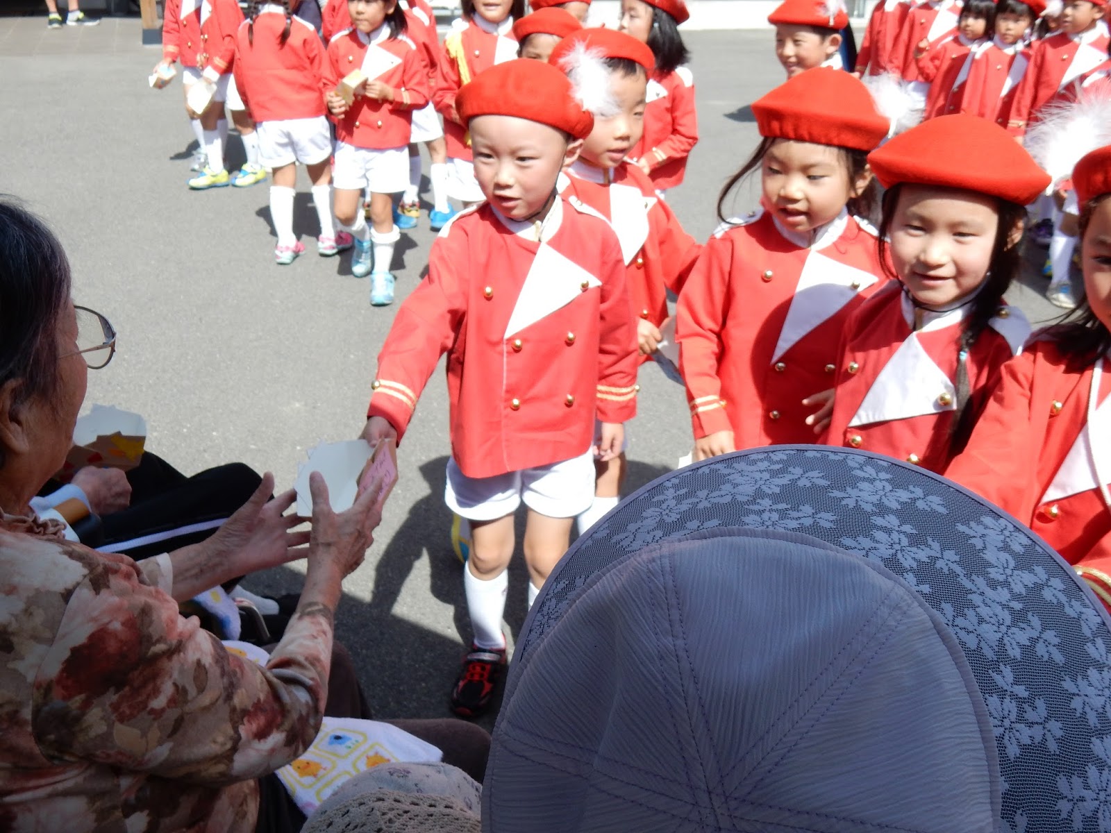演奏の後は、おじいさんたちに手作りのプレゼントを渡しました。照れくさそうに『元気でね。』 『見てくれてありがとう』と声を掛けていました。おばあさんたちの嬉しそうな顔を見て、子どもたちも満足そうでしたよ!