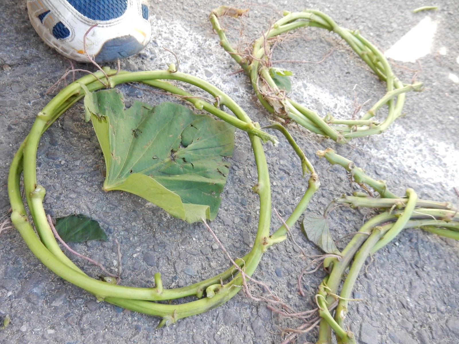 抜き終わったイモではなく、茎。こちらもとっても大切です。太い茎から、細く枝分かれした茎をちぎっています。なんか…田舎の畑で働くレディーって感じ(笑)おしゃべりもせず、真剣に作業をする働き者さんたちでした。この細い茎は、きんぴらにして食べると美味しって知ってました?“食べれるよ~”という言葉があったから、みんなあんなに真剣になったのかもしれないですね!