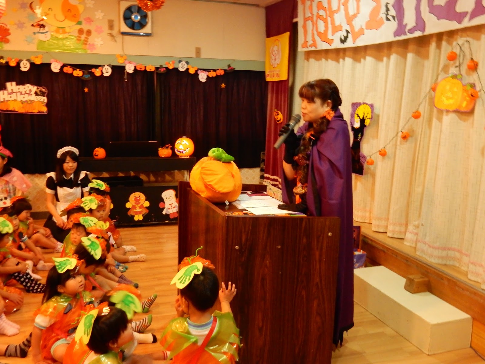 今日はハロウィンパーティーでした。そもそもハロウィンってどんな日か、ご存知ですか?10月31日がハロウィン。外国ではこの日に、亡くなった人がお家に帰ってくるんですって。日本のお盆みたいな感覚です。その時に、悪魔も一緒に着いてきてしまうから身を守ったり、魔よけの火をたいたりするそうです。それが今では、みんなでお化けや魔女に仮装して、“trick or treat!”お菓子をくれなきゃイタズラしちゃうぞ!と言いながら近所を歩き、たくさんお菓子をもらう子どもたちにはいいことばらり♪のお祭りになったのです。