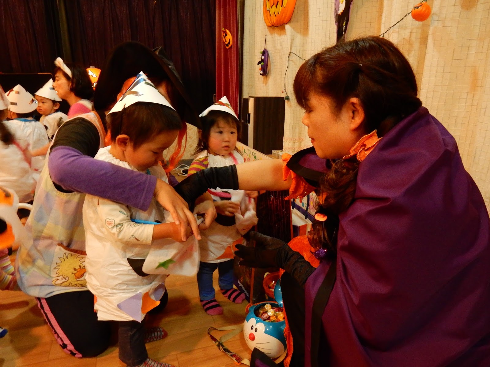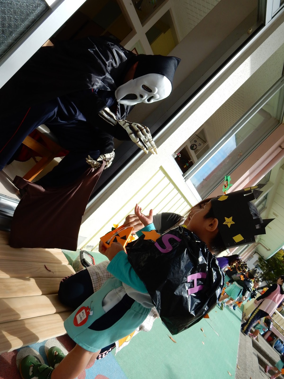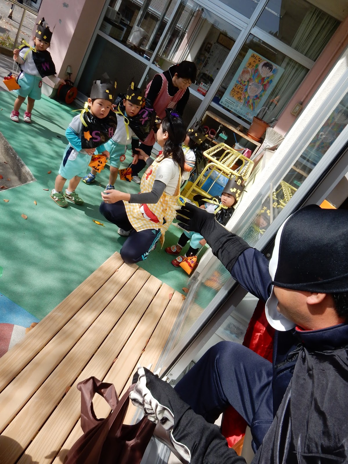 なかなか1歩が踏み出せず、後ずさりするお友達もいましたが、園長先生が仮装していたことが分かると、勇気を出してお菓子をもらえました。