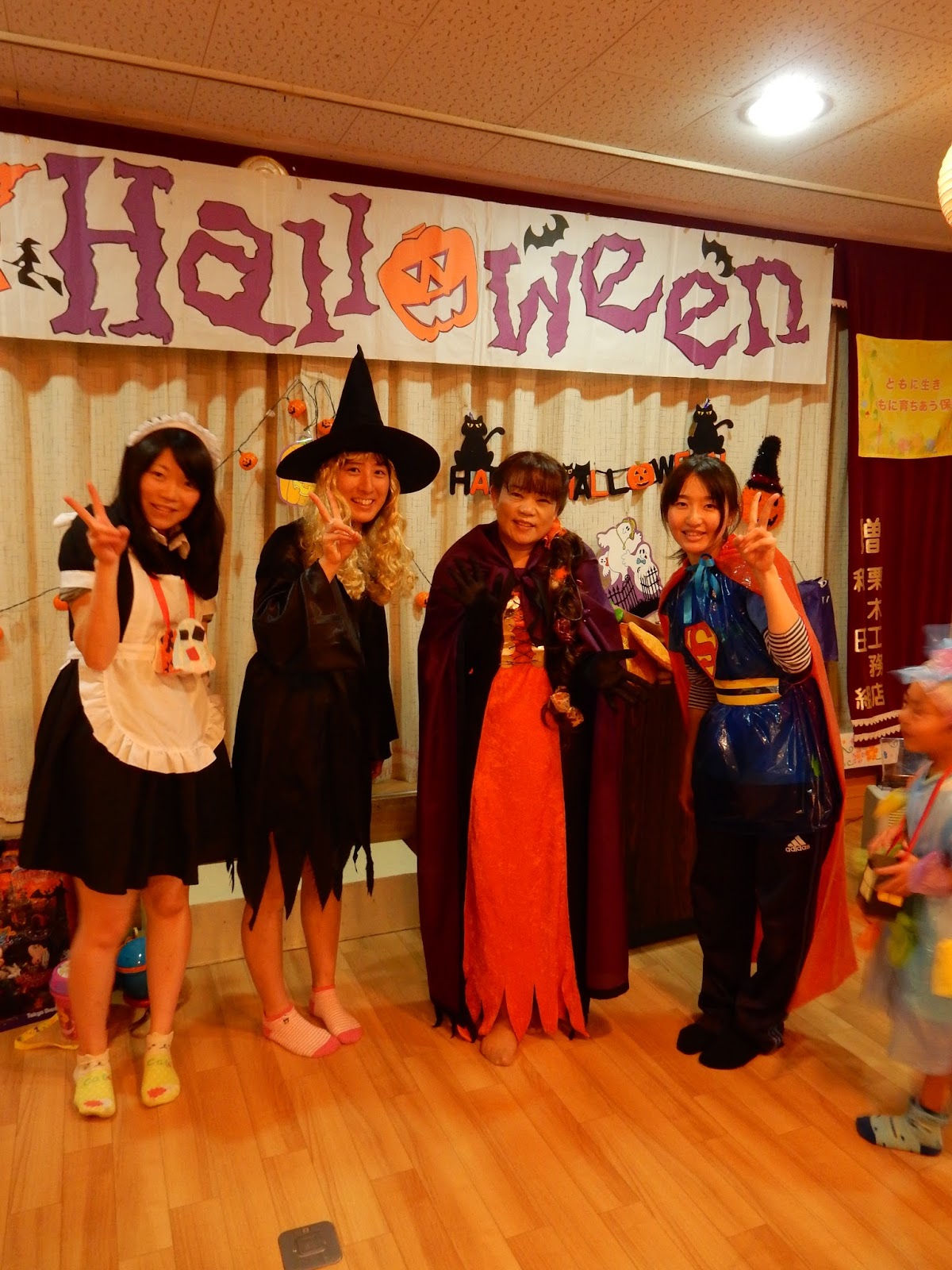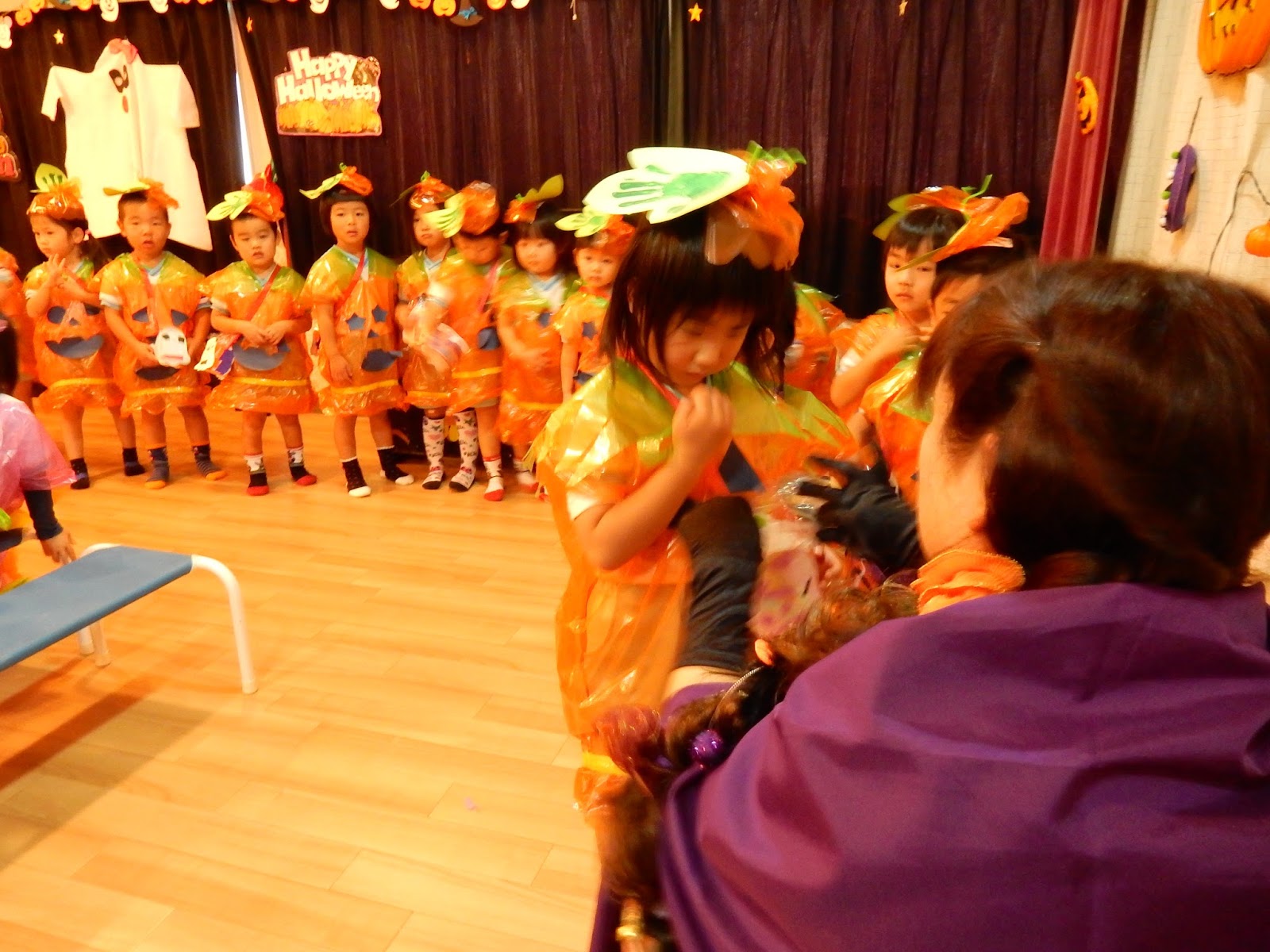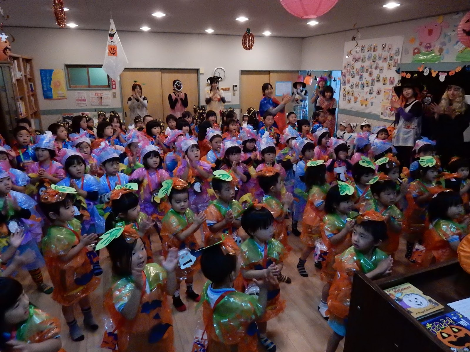 各クラス、いろんな工夫が見られる衣装になりました。お菓子を入れるための箱や袋を持って、準備万端です!今日は、英会話でお世話になっているキャンディー先生が来てくれて、パーティーを盛り上げてくれました!