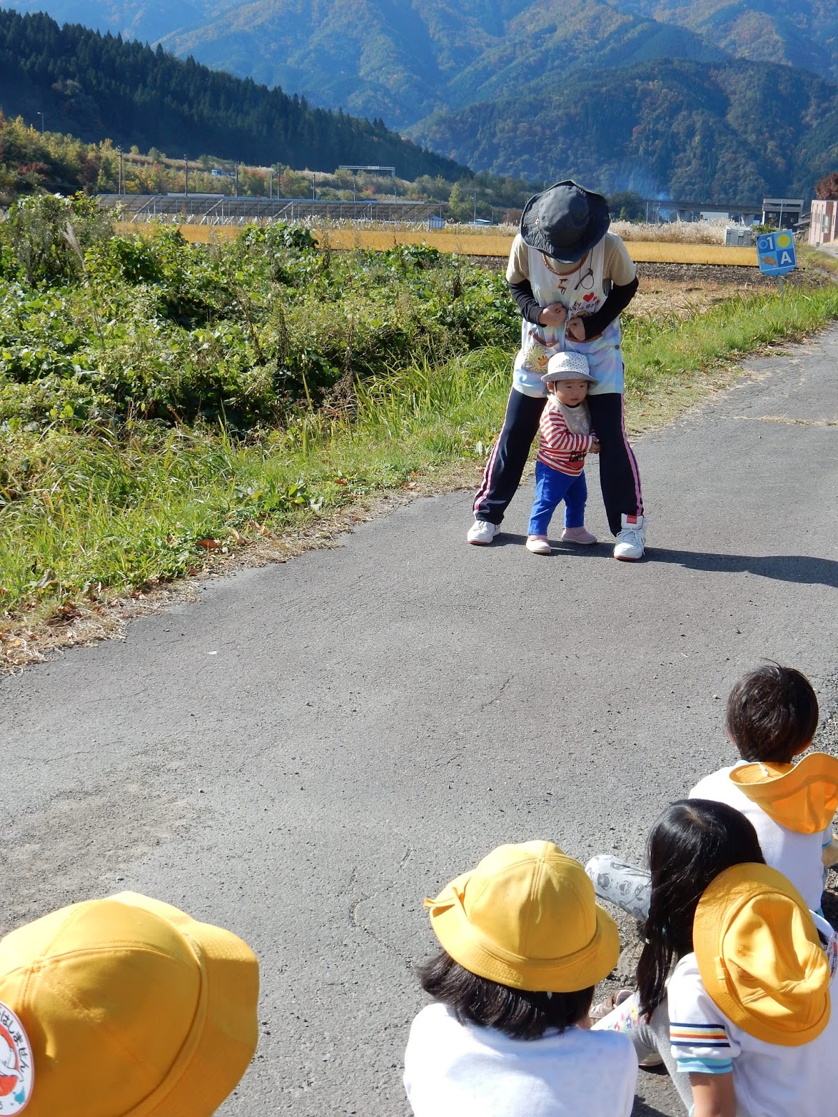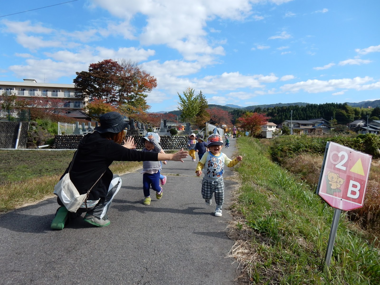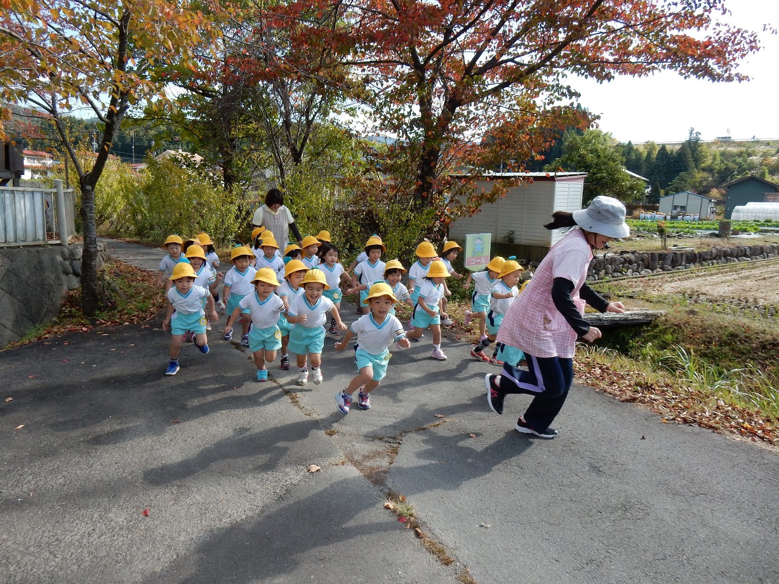ゆりさんとひまわりさんは同じコースを走ります。田んぼを挟んだ向こう側の道から、ぐるりと回ってゴールを目指します。自分のペースで、最後まで走りきることを大切にしています。『がんばれ!!』とゴール付近では他のクラスのお友達も声援を送ってくれます。当日は、お母さん、お父さんと走ることをとても楽しみにしています。一緒に汗を流しましょう!