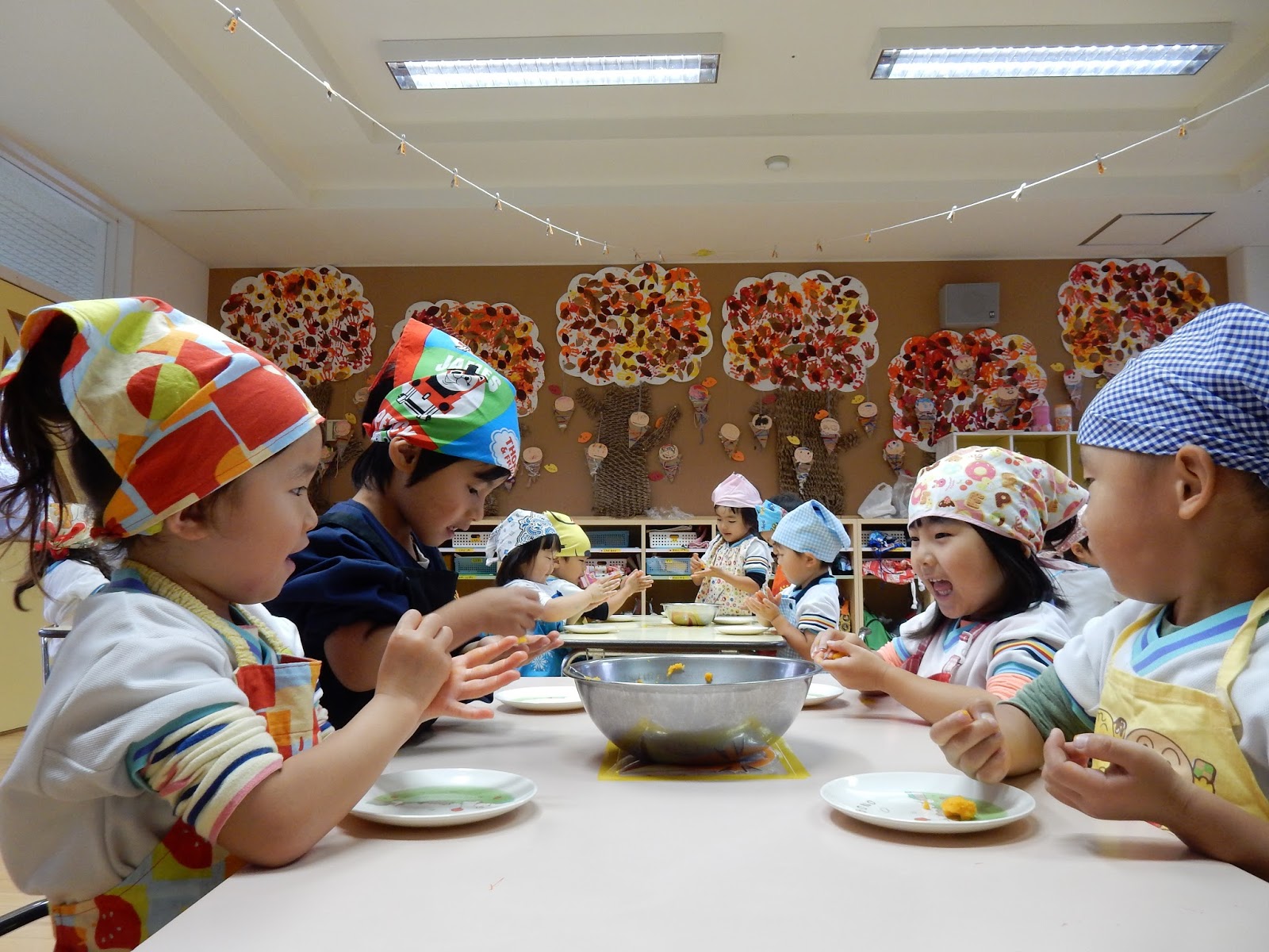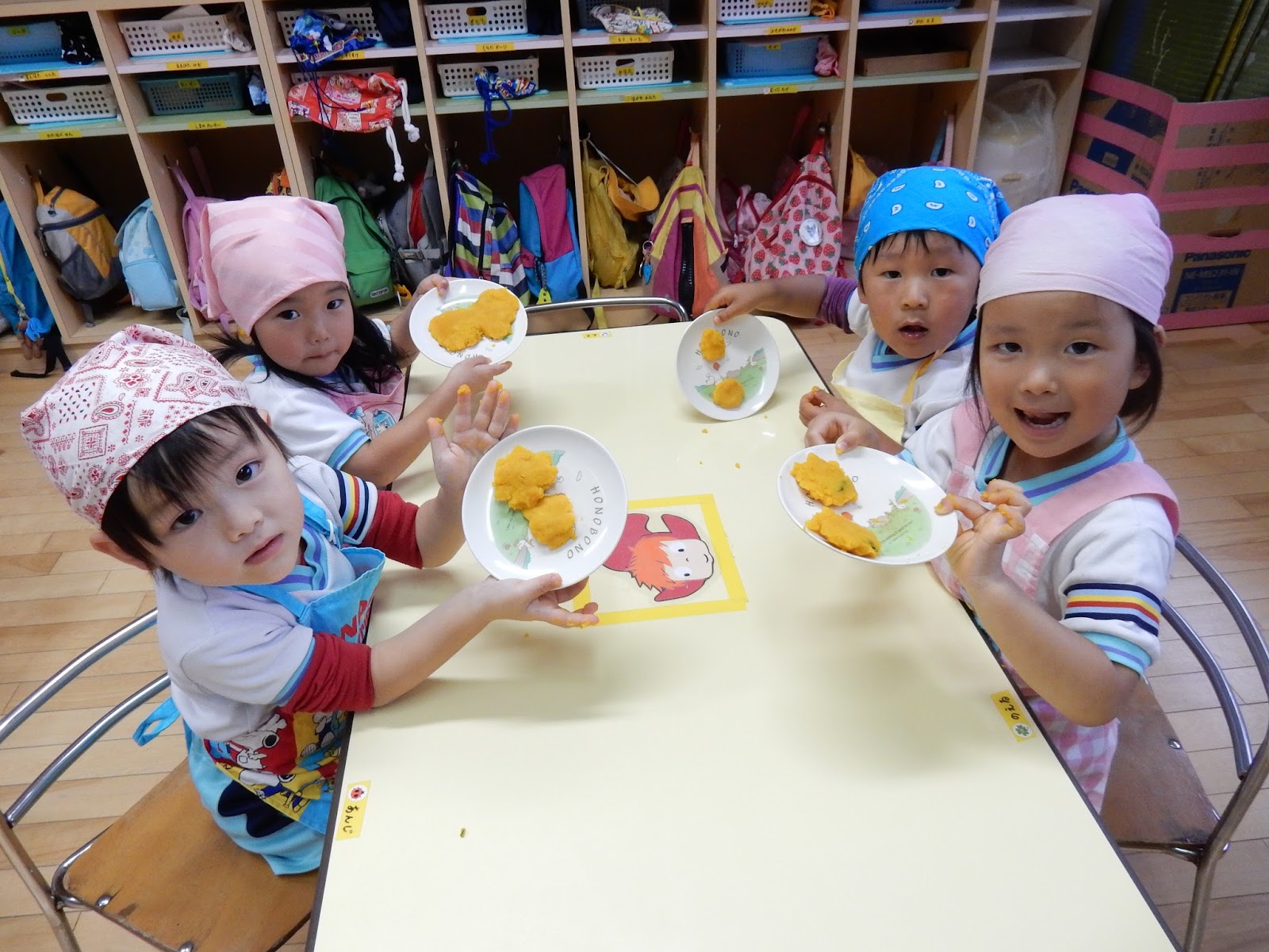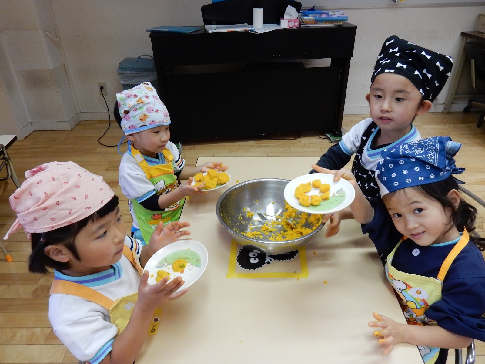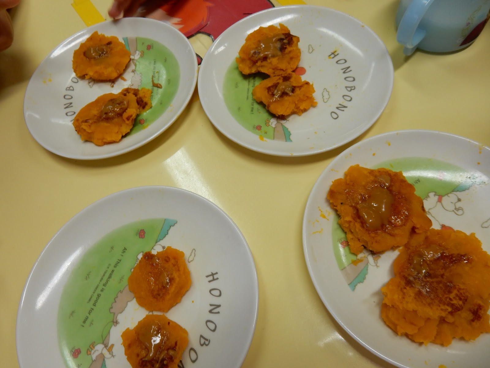 大きいのから小さいのまで、いろいろな形に仕上がりました。ちょっと粘土遊びみたいで楽しそうでした♪もちろん手についたかぼちゃ餡、こっそり味見してる子もちらほら(笑)クッキングの楽しみの一つです!