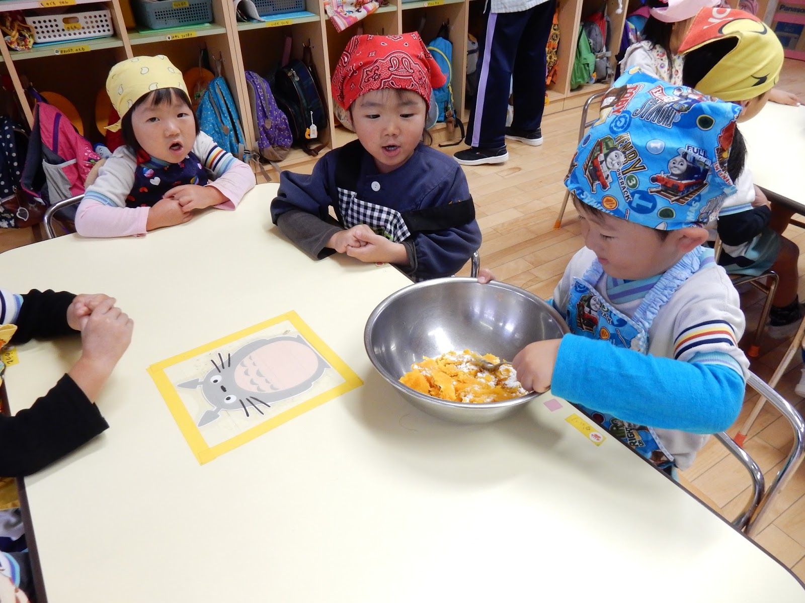 よく混ざったら、今度は形作り。手のひらにとって、丸くしていきます。『かぼちゃの匂い!』 『やわらかいなぁ!』会話をしながらどんどん作っていきます。こどもたちが作ると...