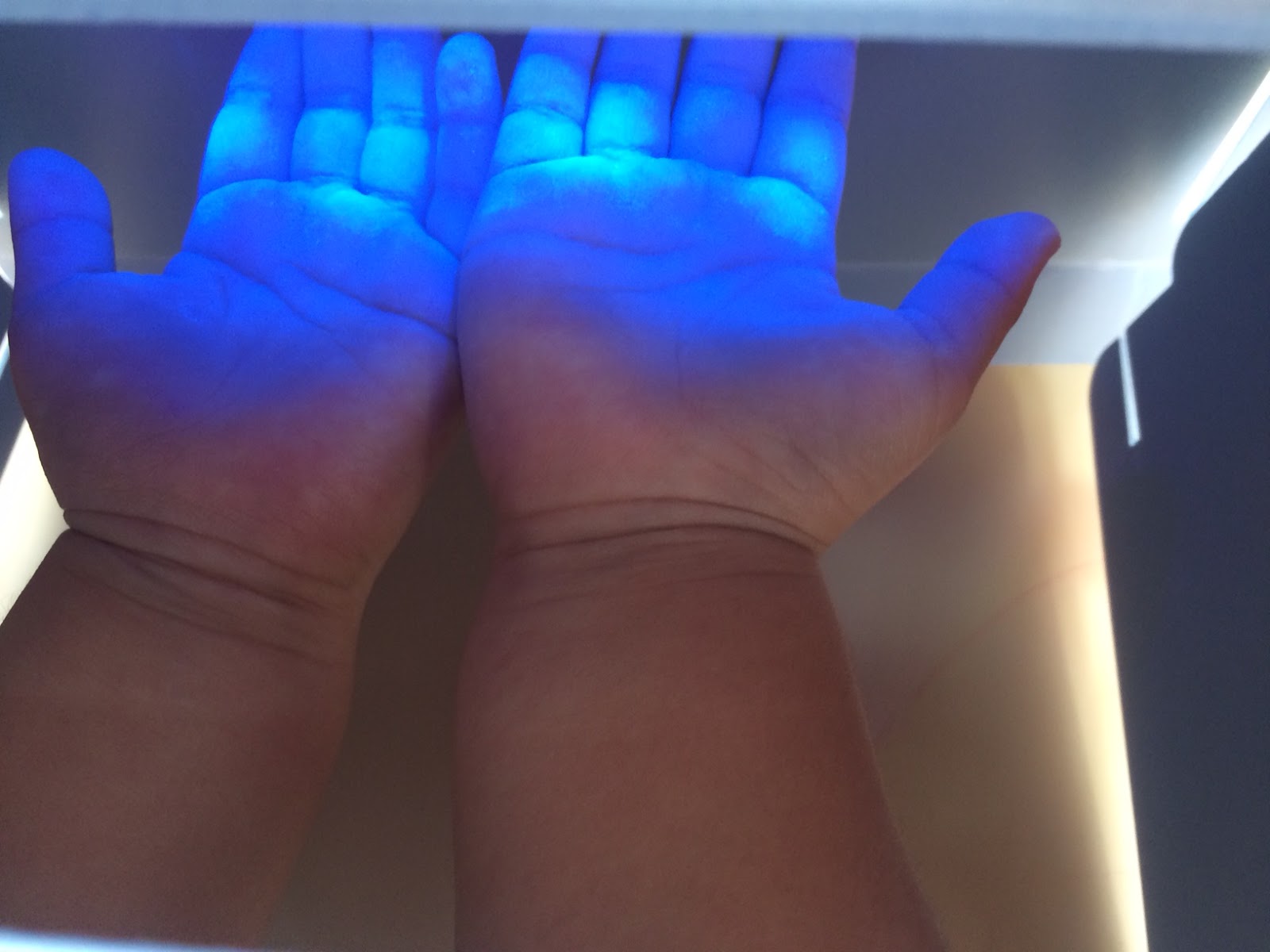 ブラックライトが、手の汚れに反応して白っぽく見えるんです。子どもたちが、実際に汚れを確認できるので、手洗い指導にとても効果的です。手のひらはきれいですが、指先や、手のしわのところに反応したり、