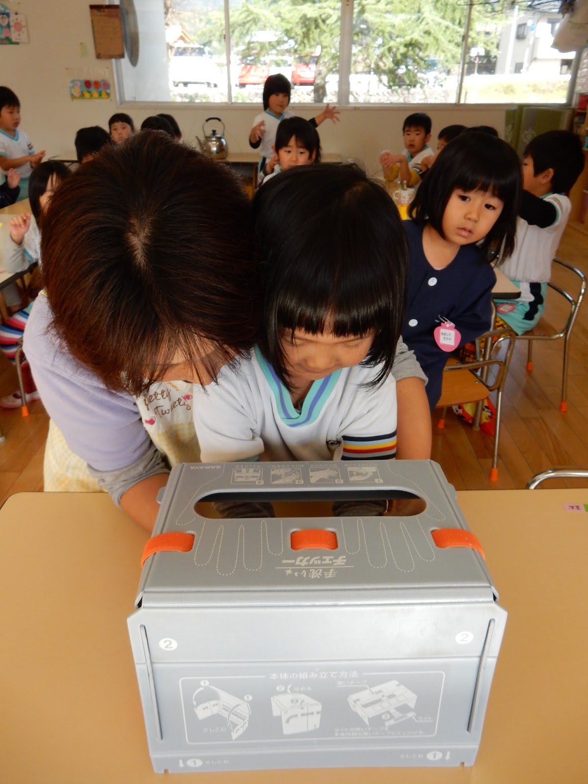 この手前にある箱。「手洗いチェックマシーン」です。専用のクリームを手に塗り、この箱の中に入れると。。。