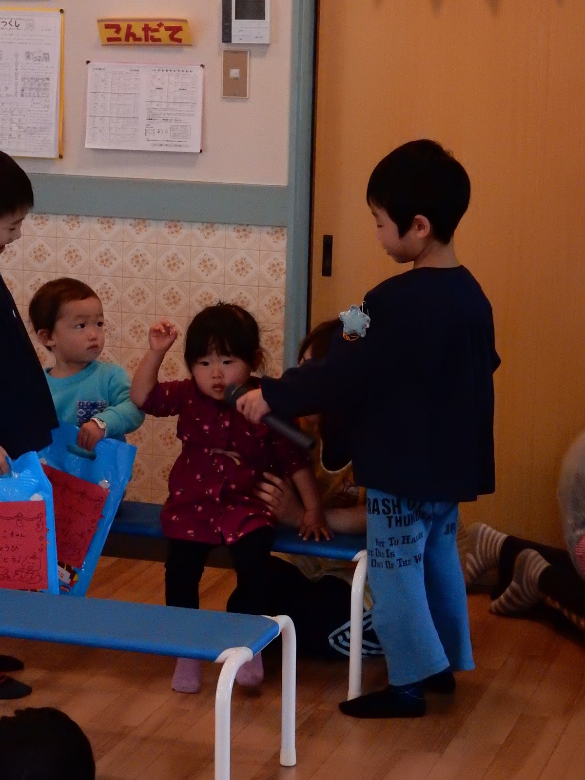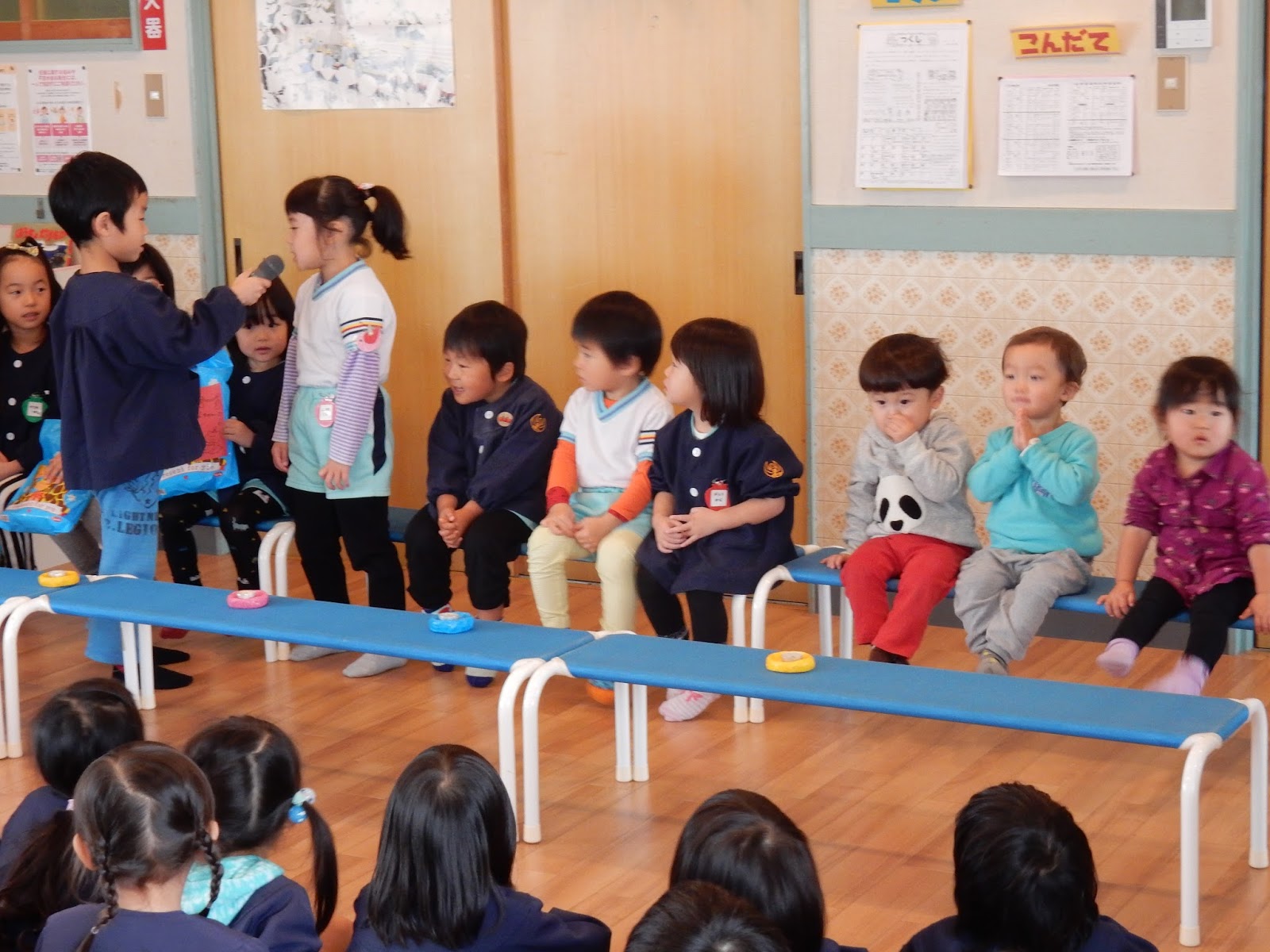 誕生日会の流れもみんな覚え、ひまわりさんの司会も板についてきました!まだお名前を自分で言えない子には、お当番さんが名前を呼んでくれるんです。『はぁい!』と上手にお返事してくれました。
