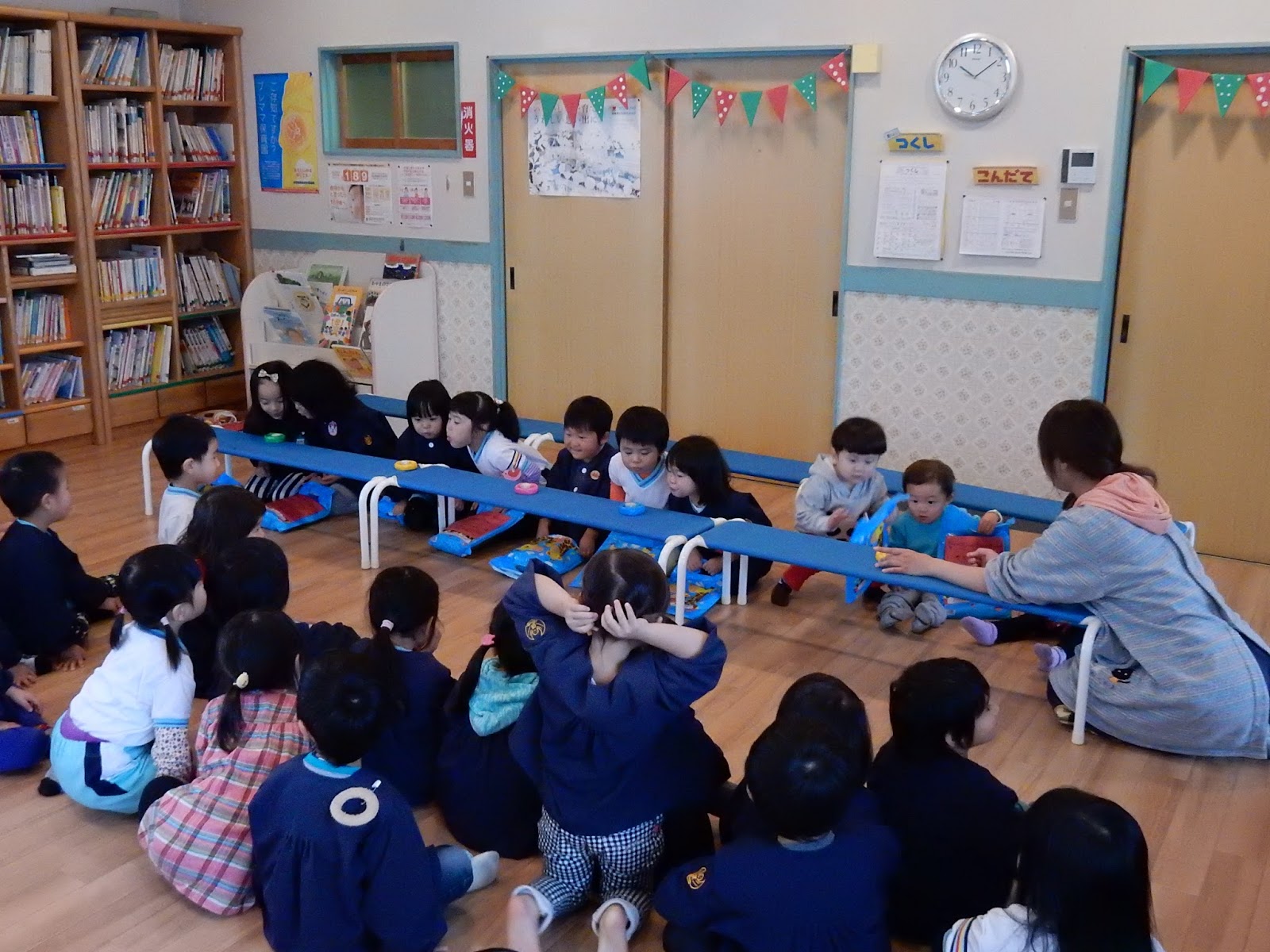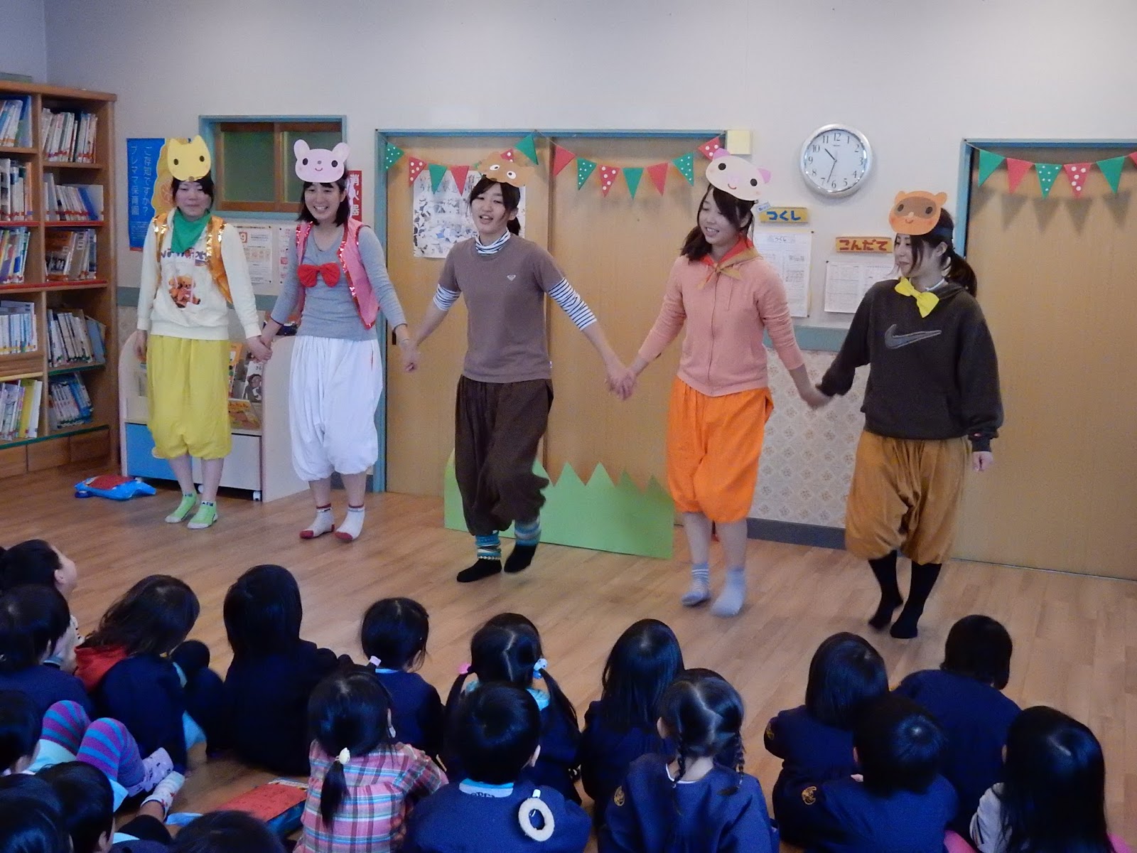 一緒に歌をうたってくれたり、楽器の演奏を真剣に見てくれました。衣装を着た先生達のダンスに、『かわいい~』 『じょうず~』と嬉しい言葉♪楽しくみてくれる姿に、演じている先生たちも、楽しかったと思いますよ!