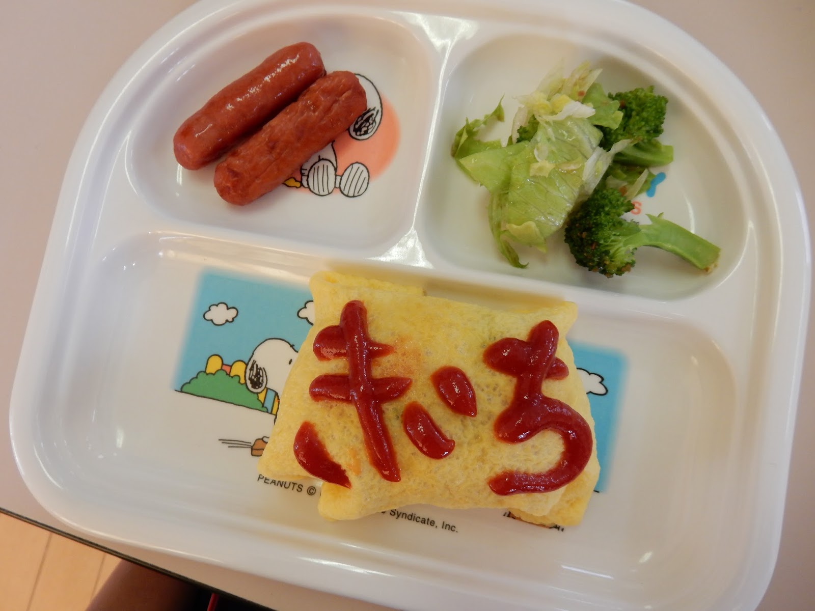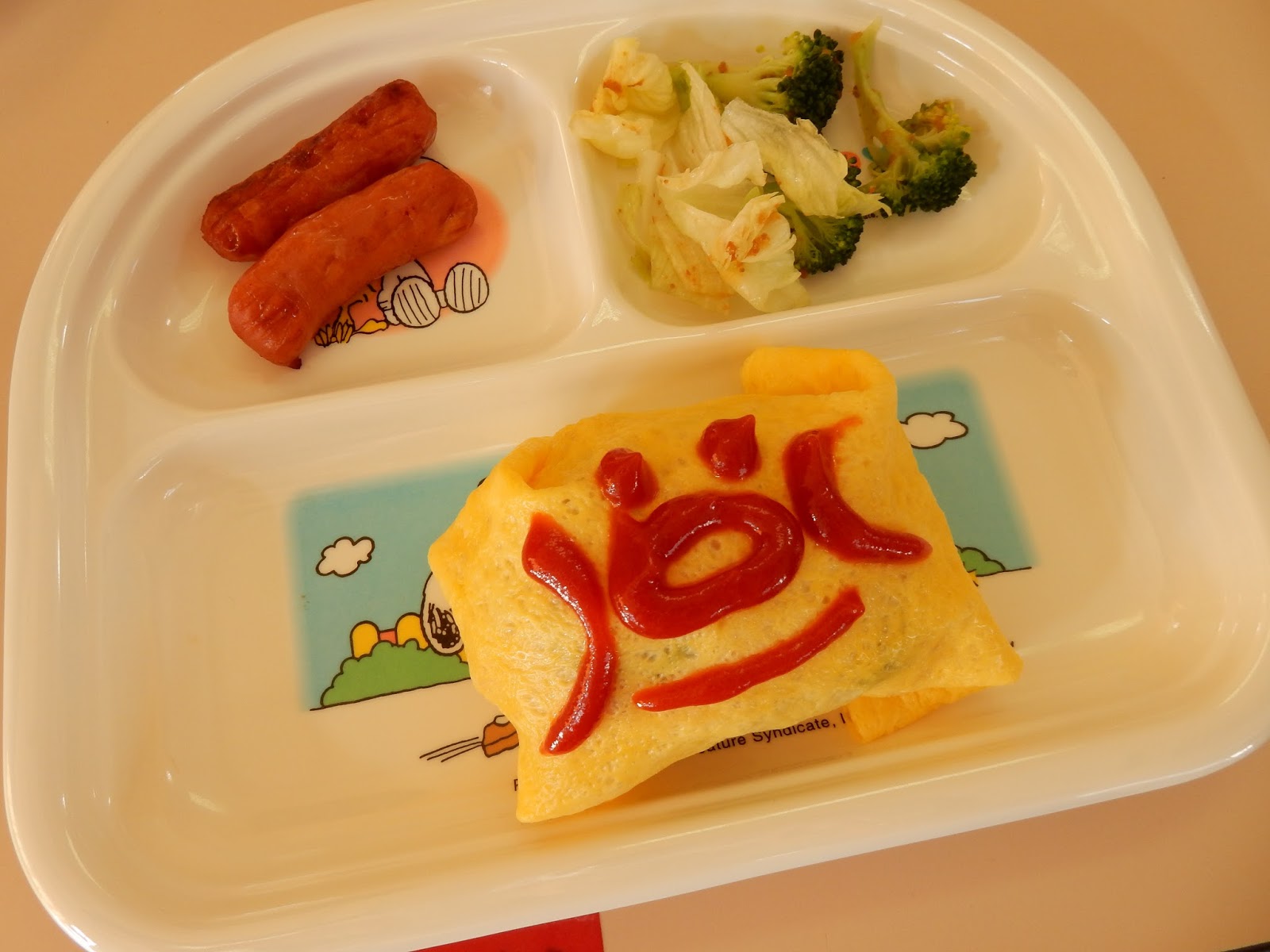 今日のお誕生日会メニューはオムライス♪それぞれのクラスで先生たちが工夫してくれましたよ!『お父さんのお顔かいて~』 『わたしはアンパンマン!』 みんなのリクエストに応えてくれた先生。あらあら、お名前書いてもらったお友達もいますね!