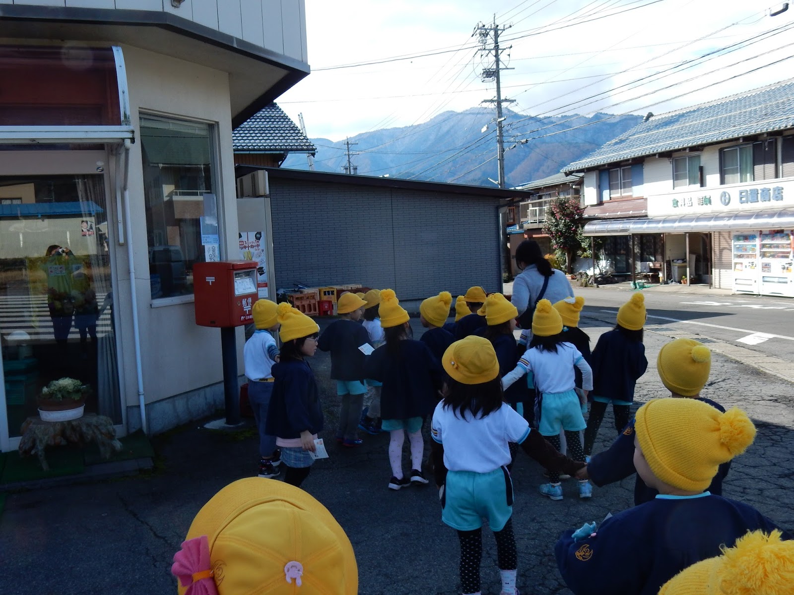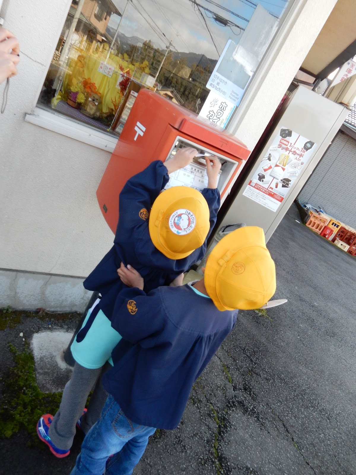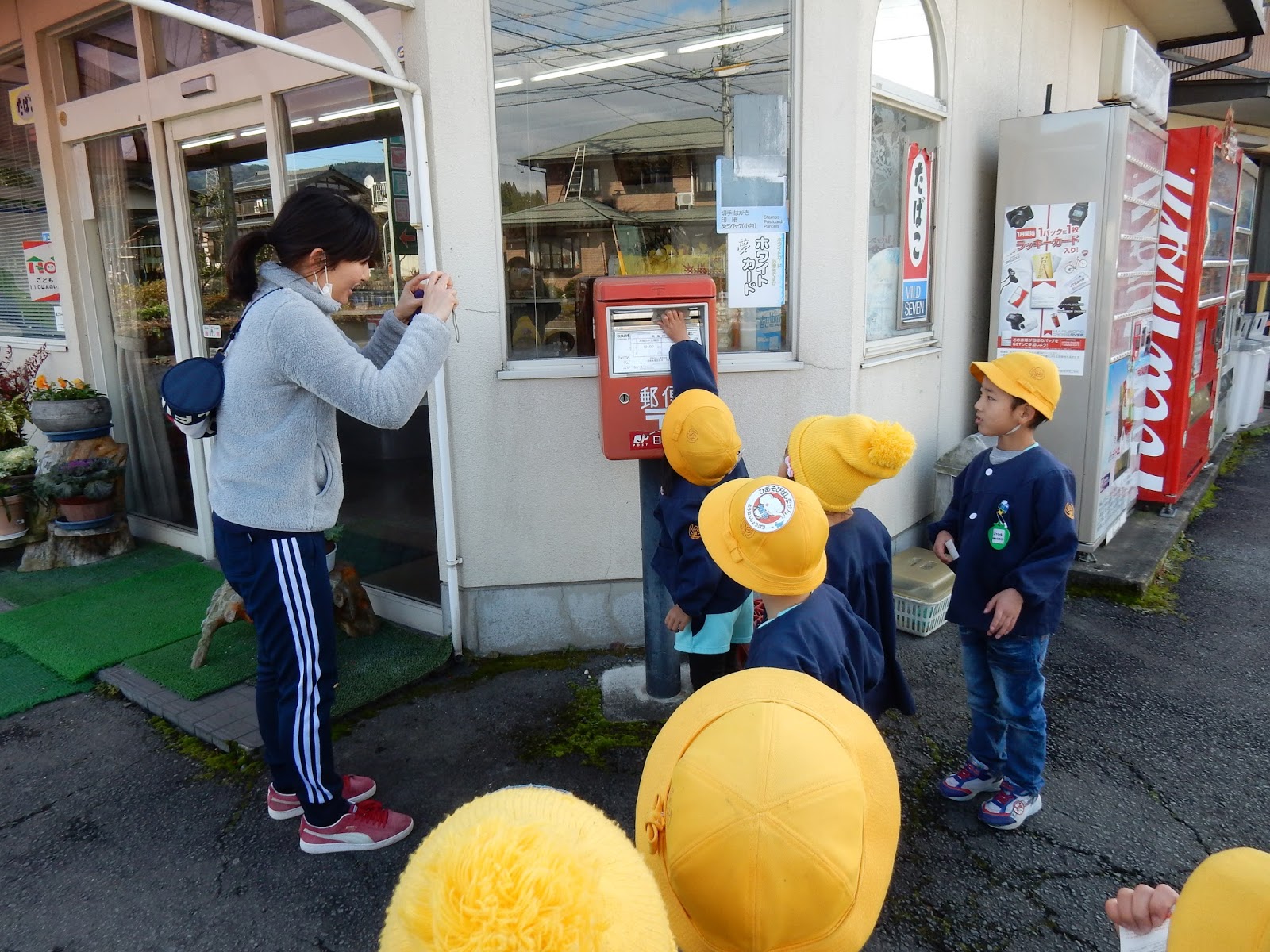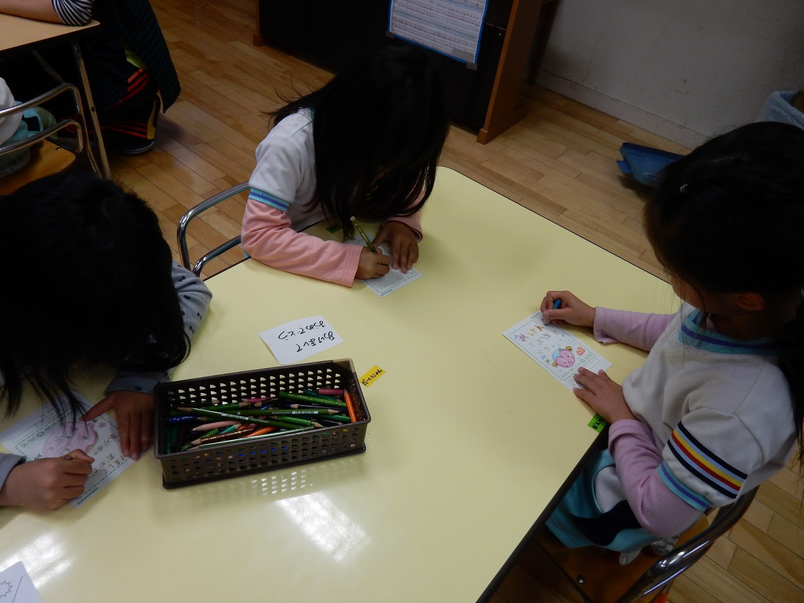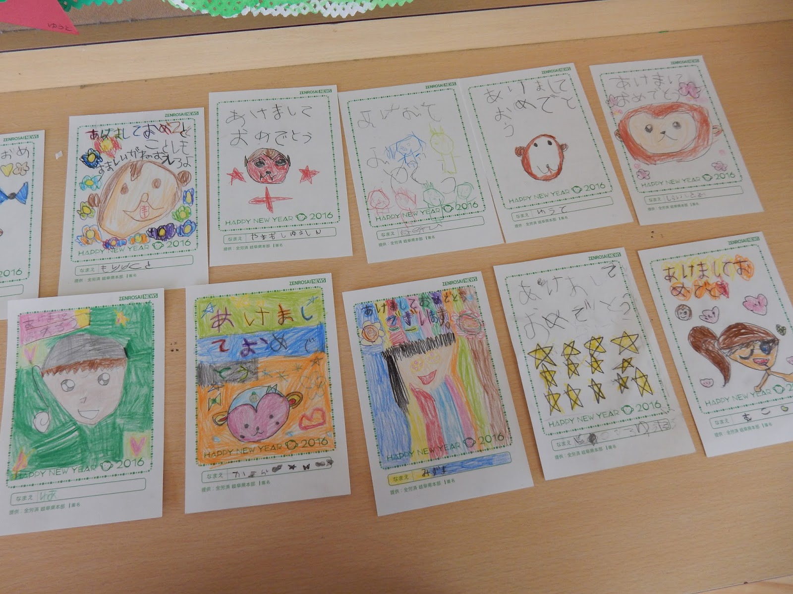 年長さん、家族あてに年賀状を書きました。一文字ずつ、丁寧に書いてくれました。来年の干支、猿の絵を描いたり、家族の似顔絵を描いたりとデザインも様々。かわいらしい年賀状が出来上がりました。