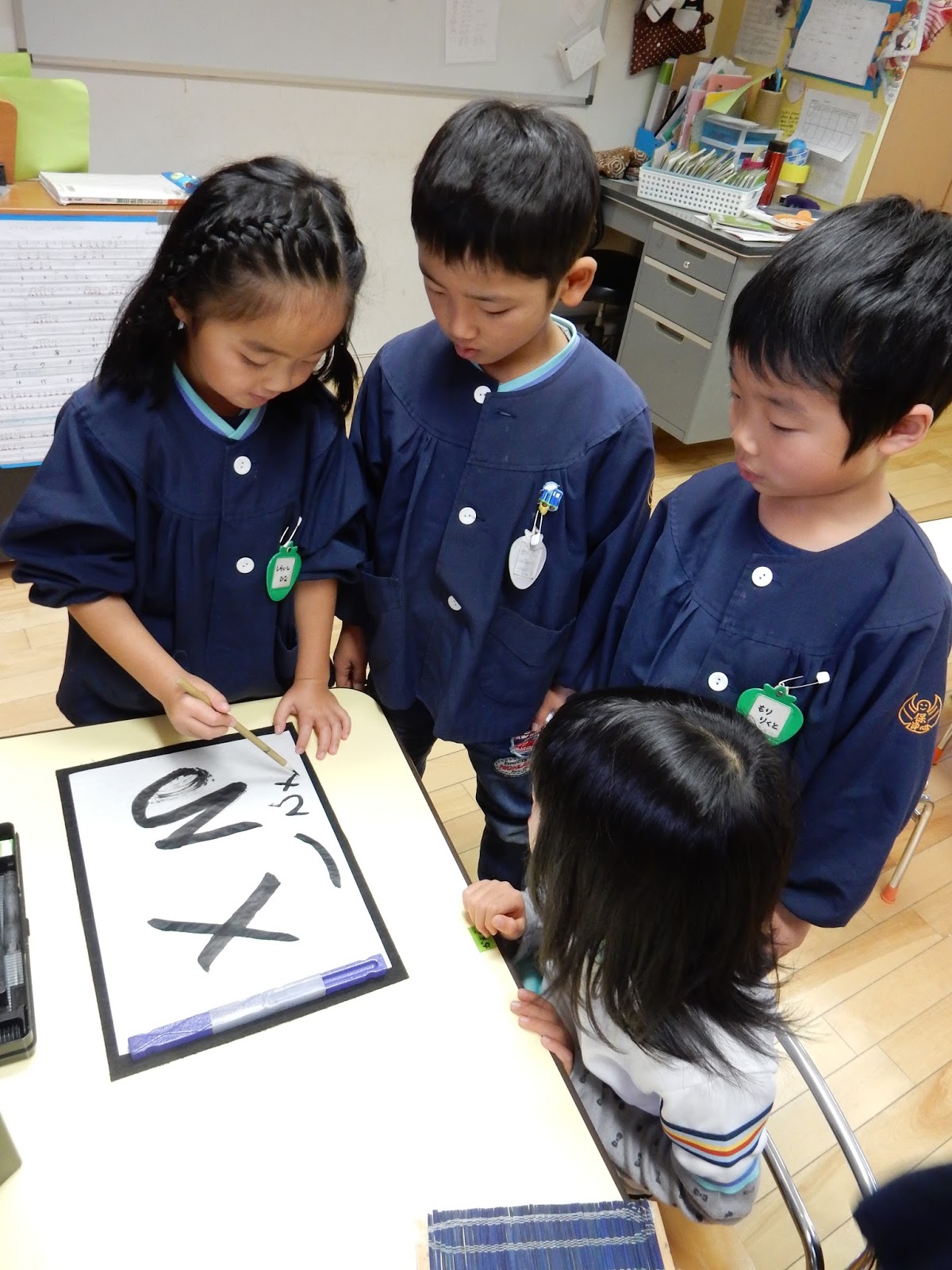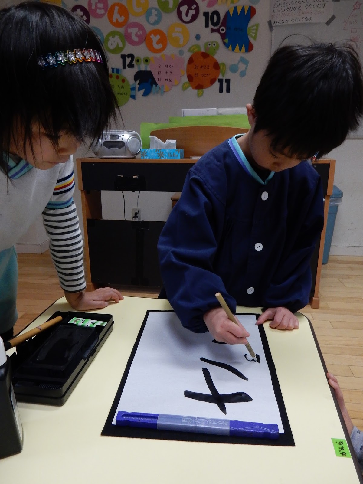 他にも、こんな事にも挑戦です。いつもの絵の具とは違うにおい、道具も本格的なものを使って、書初めです。なんとなく、背筋がシャンと伸びて、緊張した表情で書き上げてくれました。