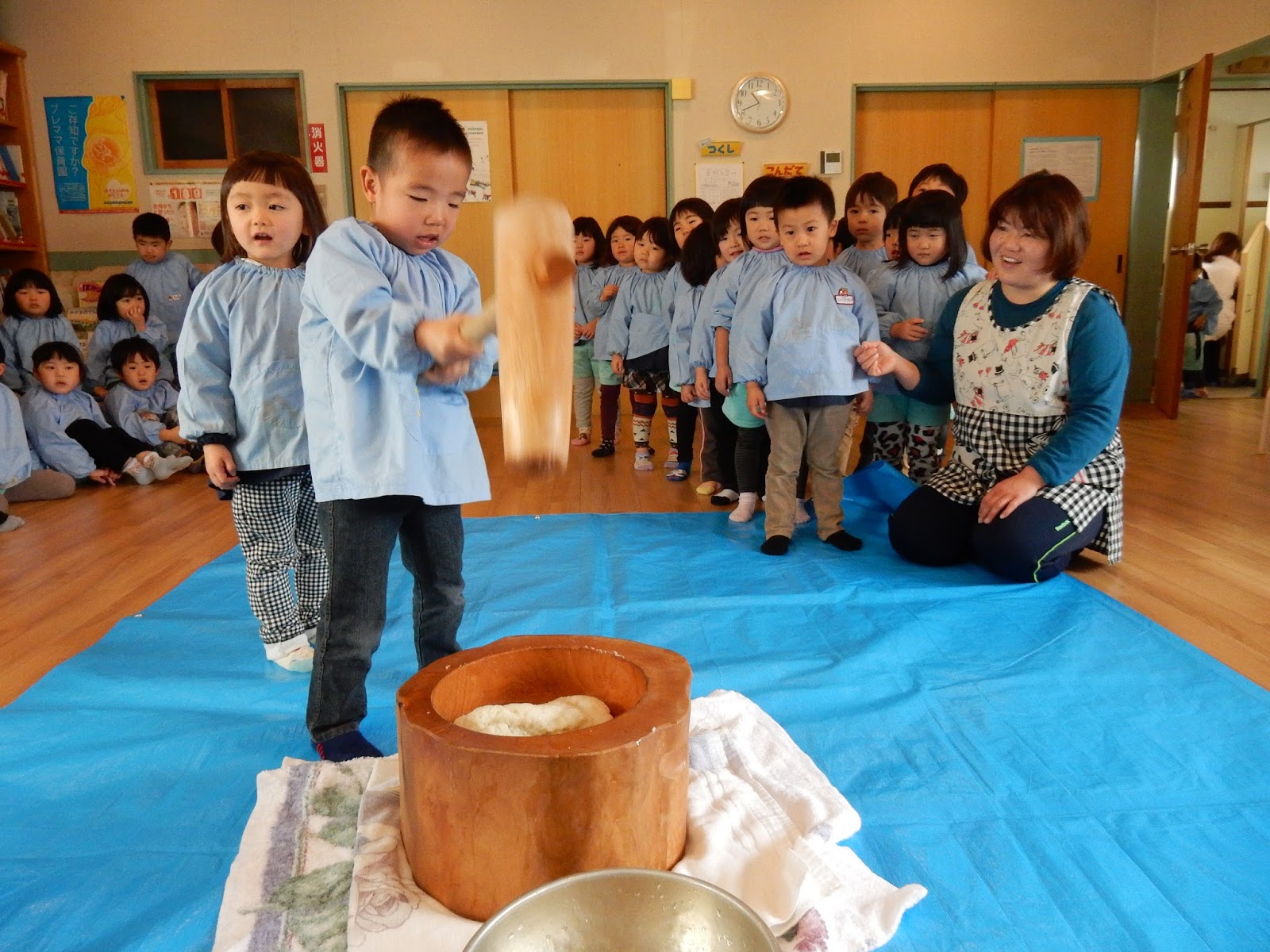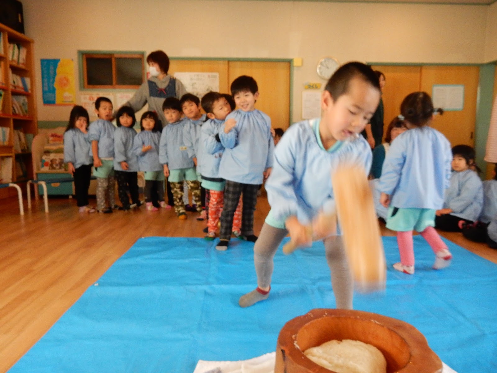 大きいお友達はさすがです!力強く杵を振り下ろしてくれました。もち米からお餅にかわってきたのか、ぺったん、ぺったんつくとお餅が伸びるようになってきました。ひまわりさんが、最後の仕上げ。やる気満々で、みんな真剣!つき終わると、『はぁぁ疲れた~』という声が。