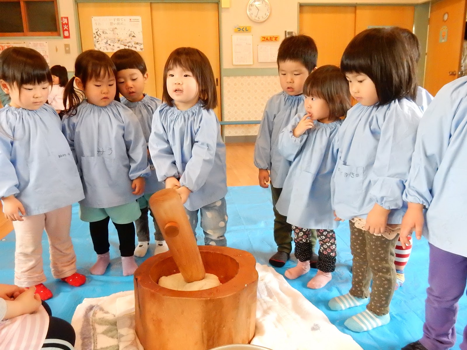 大きなお口にお餅をほおばって♡お口に入れすぎだよ~と笑われているお友達も。頑張ってついたお餅、いつもの給食以上に美味しく感じたかもしれませんね!お家から持ってきたおにぎりも、とっても美味しかったよ~!!今年1年も、たくさん食べて、みんな元気に過ごせますように!!