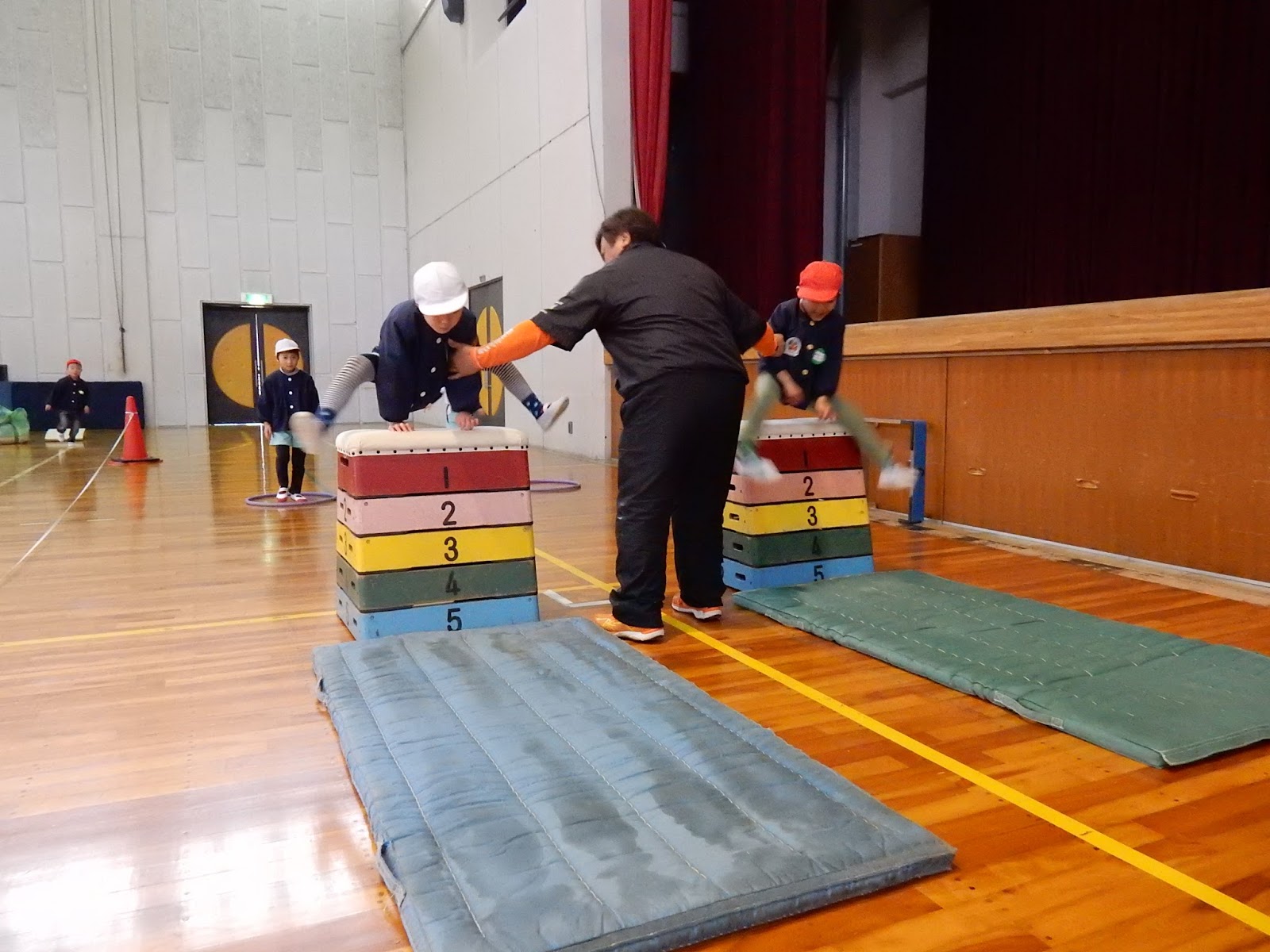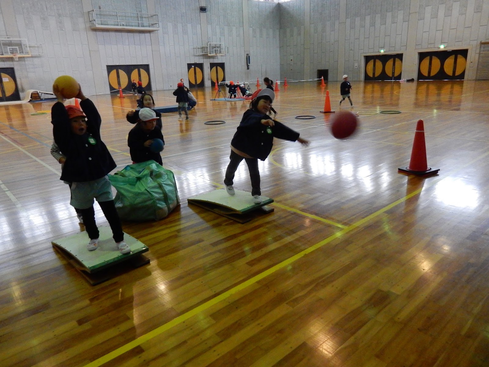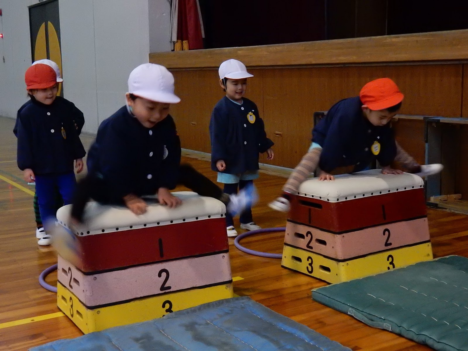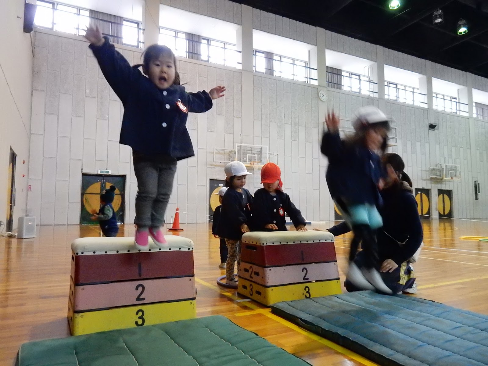 サーキット遊びでは、年齢に合わせて運動器具をたくさん並べます。今年は、まだ戸外遊びができていたので、みんなの体力も十分!元気いっぱい走り回りました!