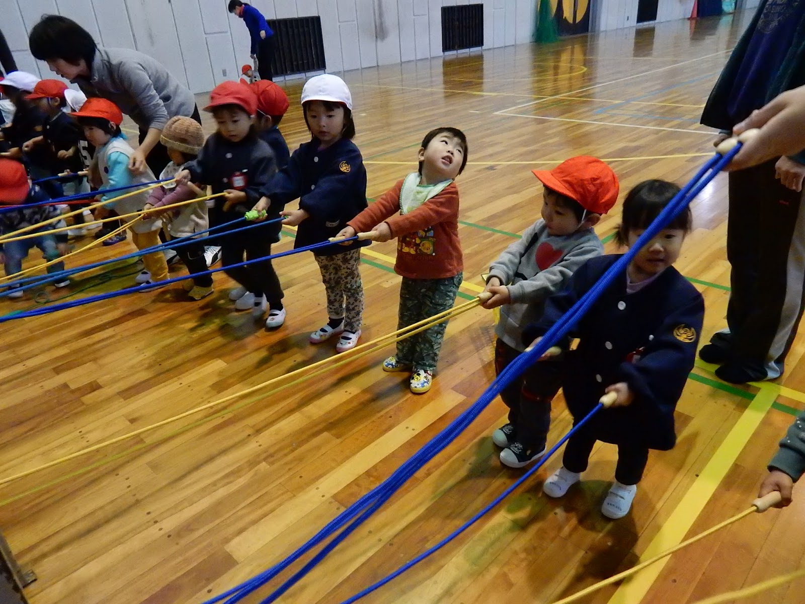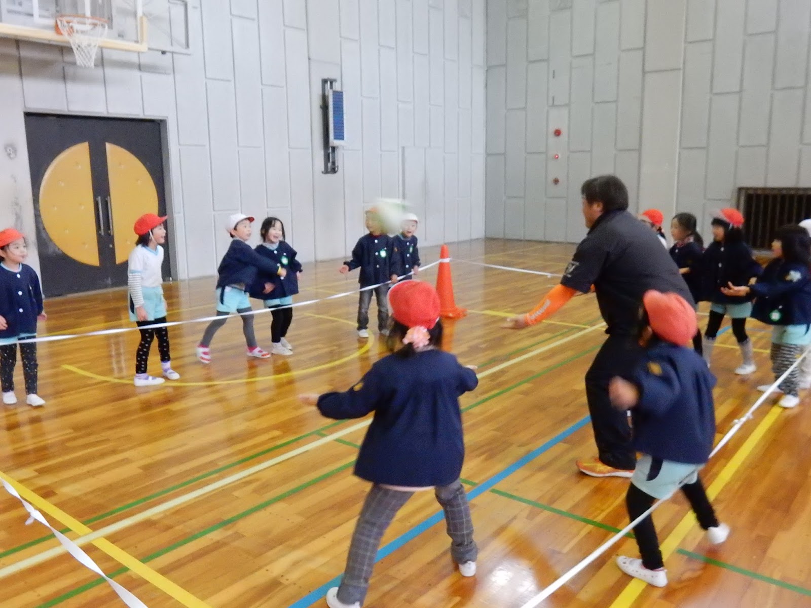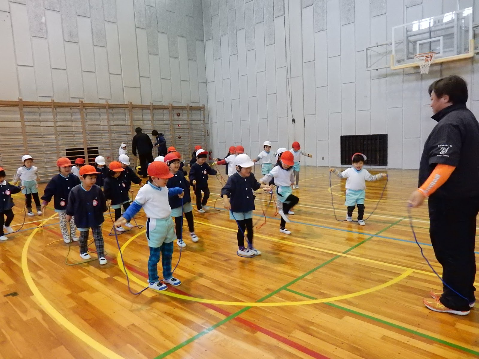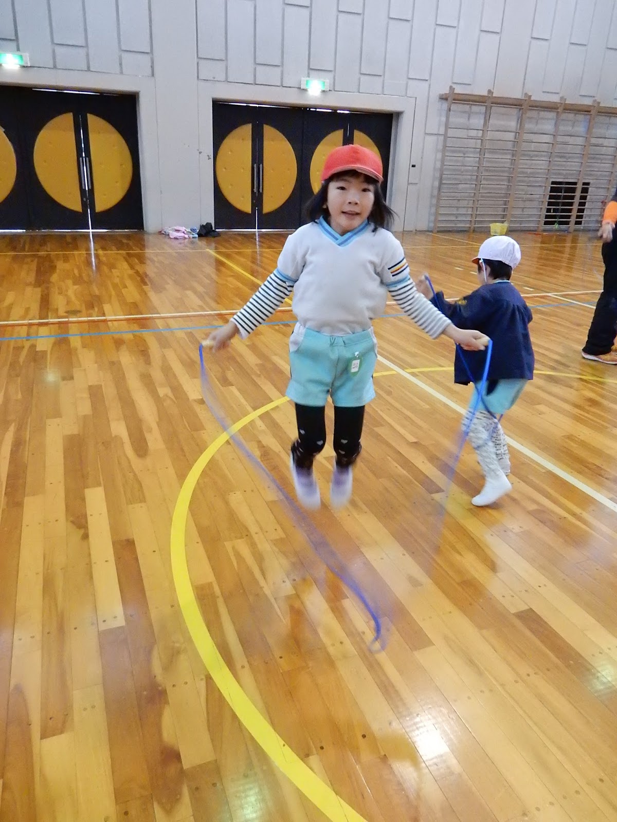 縄跳びを使って準備運動。小さいお友達は、ヘビさんにしたり、ゆらゆらブランコにしてみたり。縄跳び1本で結構楽しめていました。ゆりさんも、前跳びに挑戦。ゴロゴロ先生に跳び方を教えてもらってゆっくりやってみると、何人かの子はすぐに跳べるようになりました!ひまわりさんは、秋から取り組んでいるだけあって、みんな上手です!自信満々に、見てみて!!と、10回以上続けて跳んでくれましたよ!