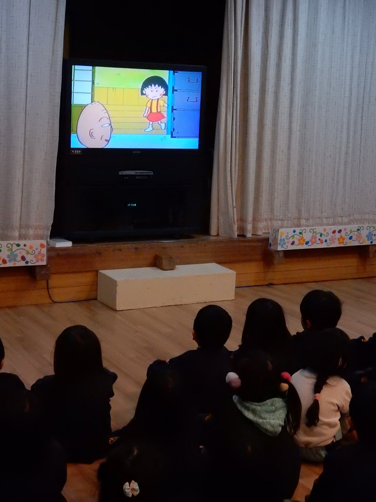 今日は、おつとめの後、避難訓練がありました。今日は、ちびまる子ちゃんが出てくるビデオで地震についてのお勉強です。