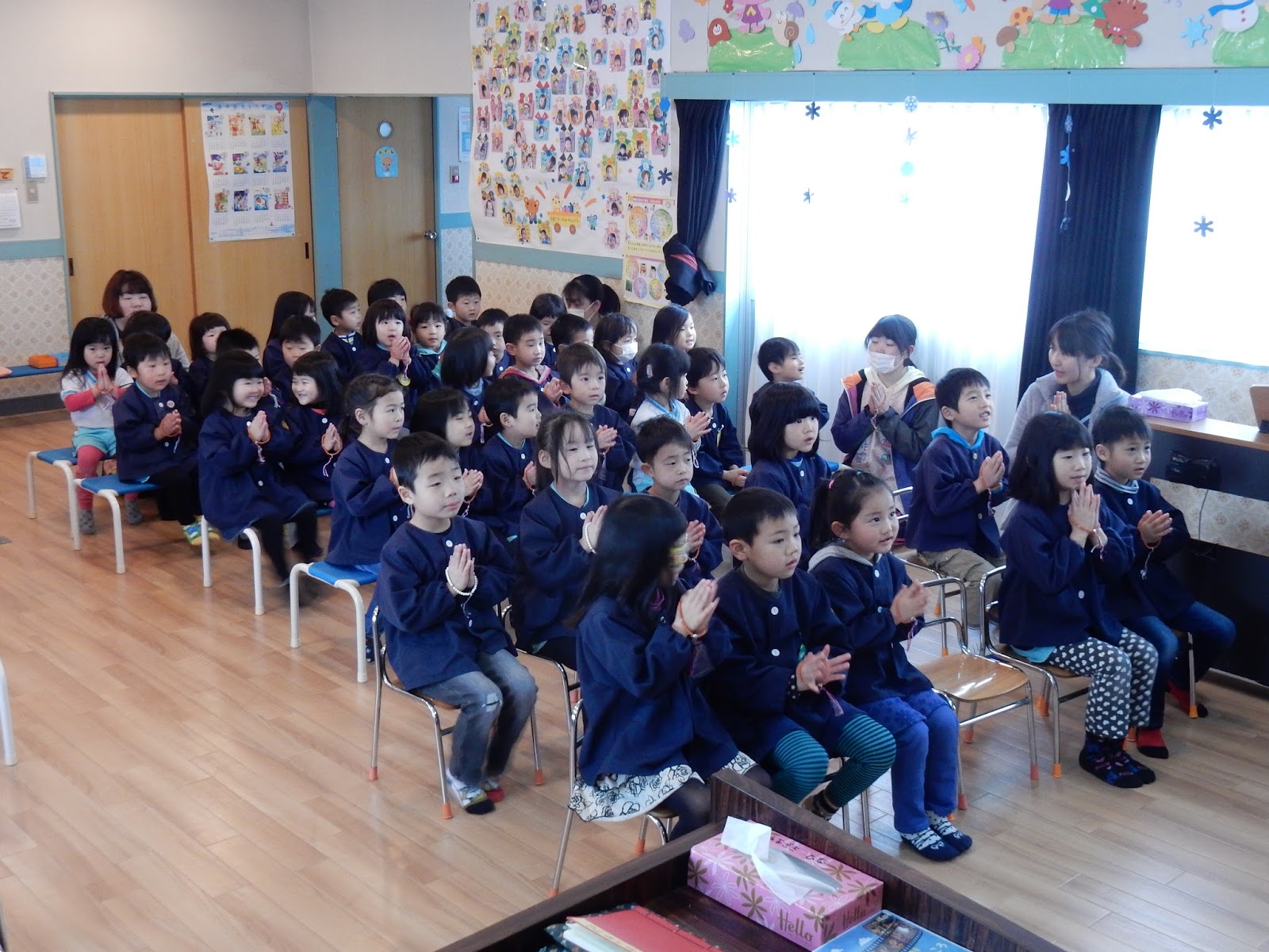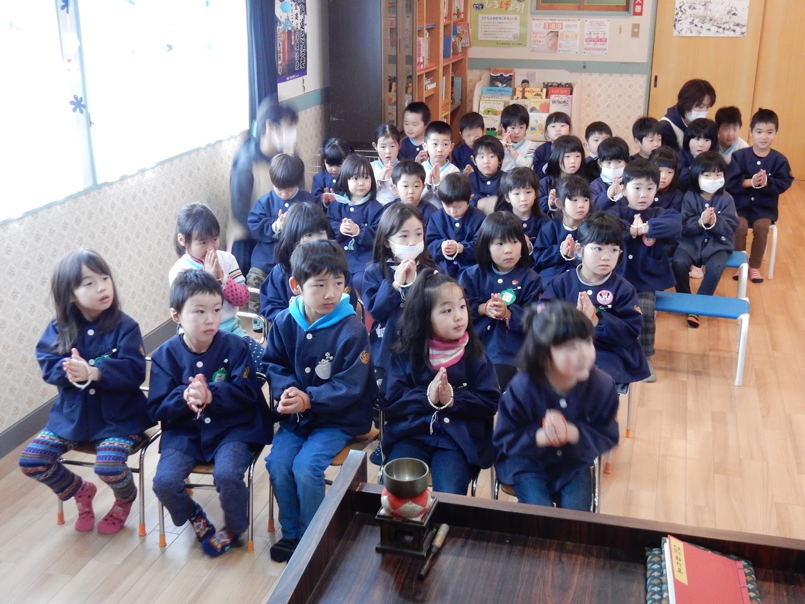お寺の御住職でもある園長先生から、お経を教えていただきます。約20分間ですが、心を落ち着かせて、静かに椅子に座ること、姿勢を正すことを身につけていきます。また、お話の中で、お釈迦様について聞いたりもします。