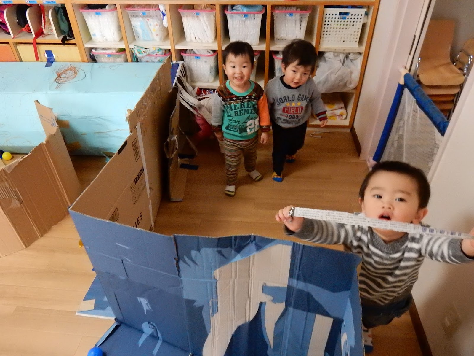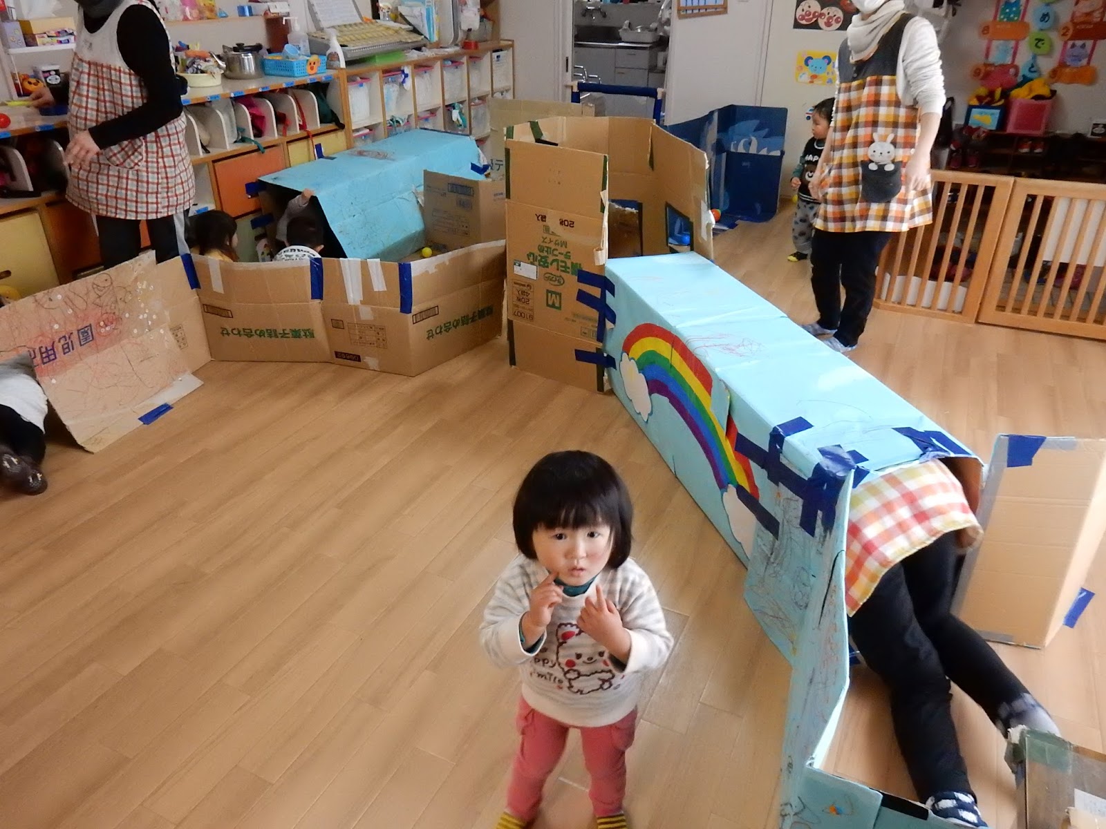 ひよこさんのお部屋では、迷路ができていました。ダンボールを組み合わせて、お部屋いっぱいに広がった迷路にみんなおおはしゃぎ!